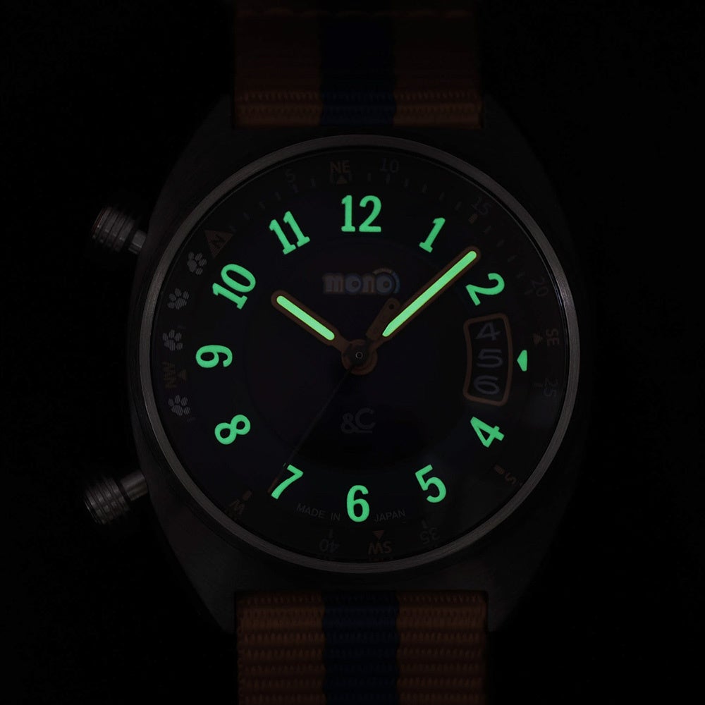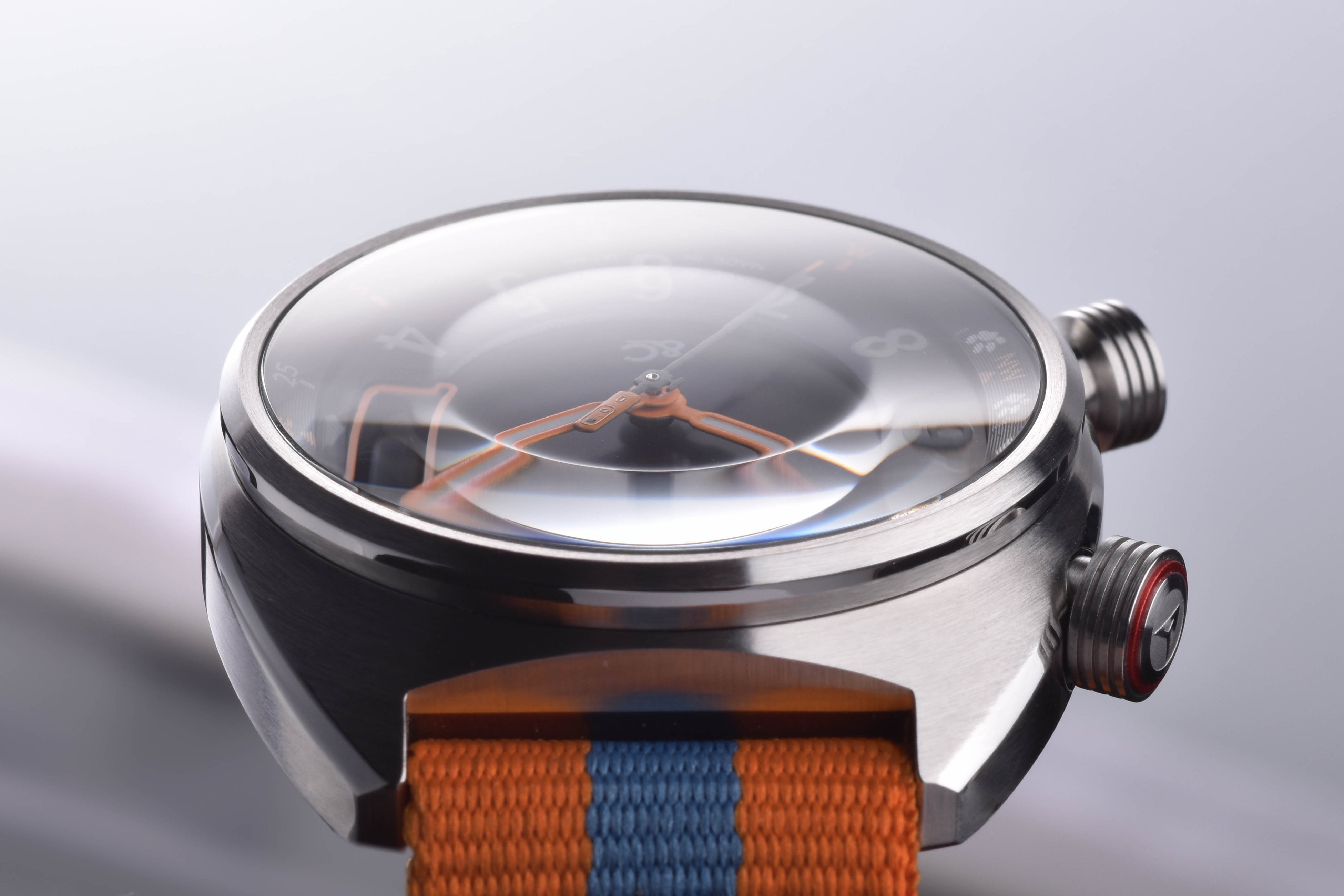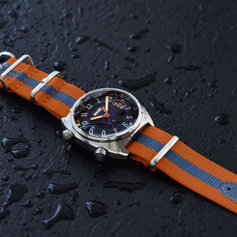カメラレンズをイメージしたドームガラス、撮影やライディング時に邪魔にならない逆リューズ構造、そして簡単に付け替えができるNATOバンドなど、作中テーマ「今週末の楽しみ方」を時計という形で表現しています。