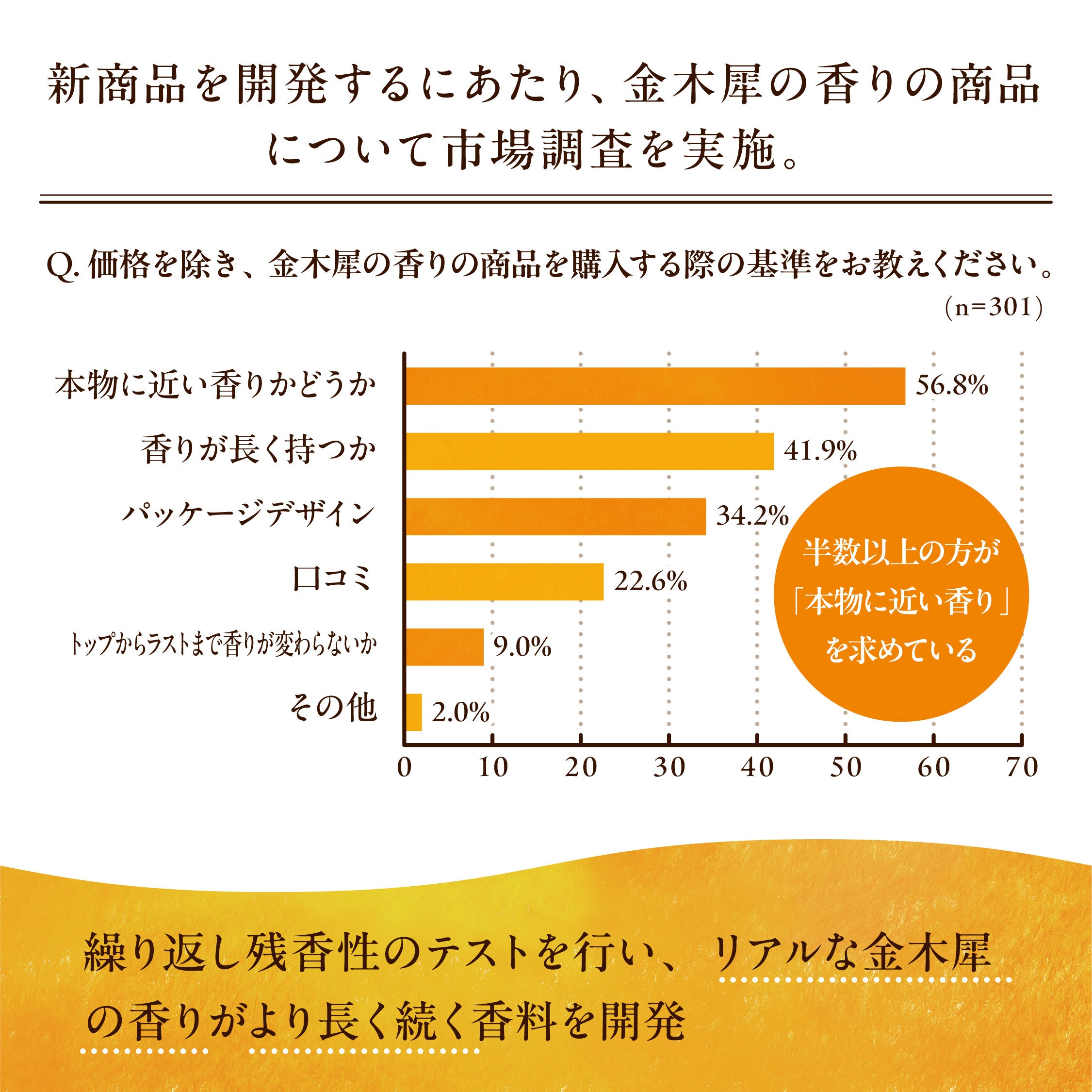 アンケートの結果、金木犀の香りの商品に求められているのは「本物に近い香りであること」「香りが長くもつこと」であるということが明らかになりました。