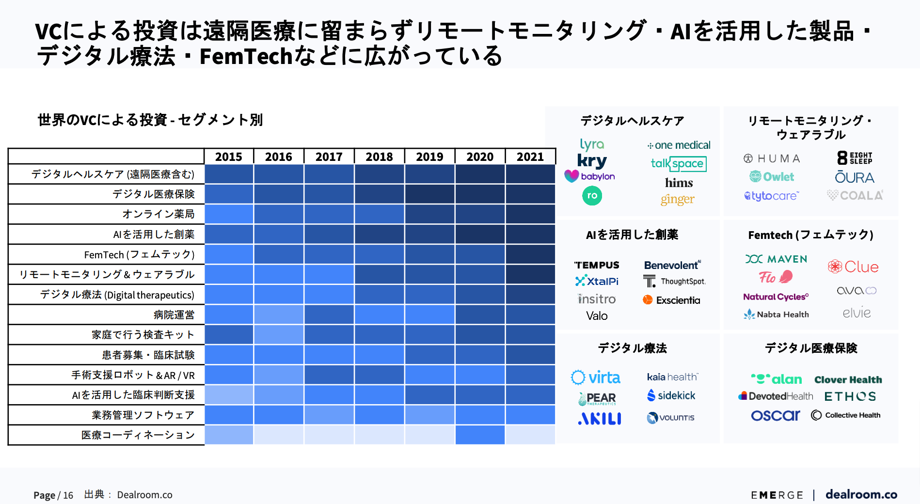 ・リモートモニタリング、デジタル療法などの具体的な投資領域