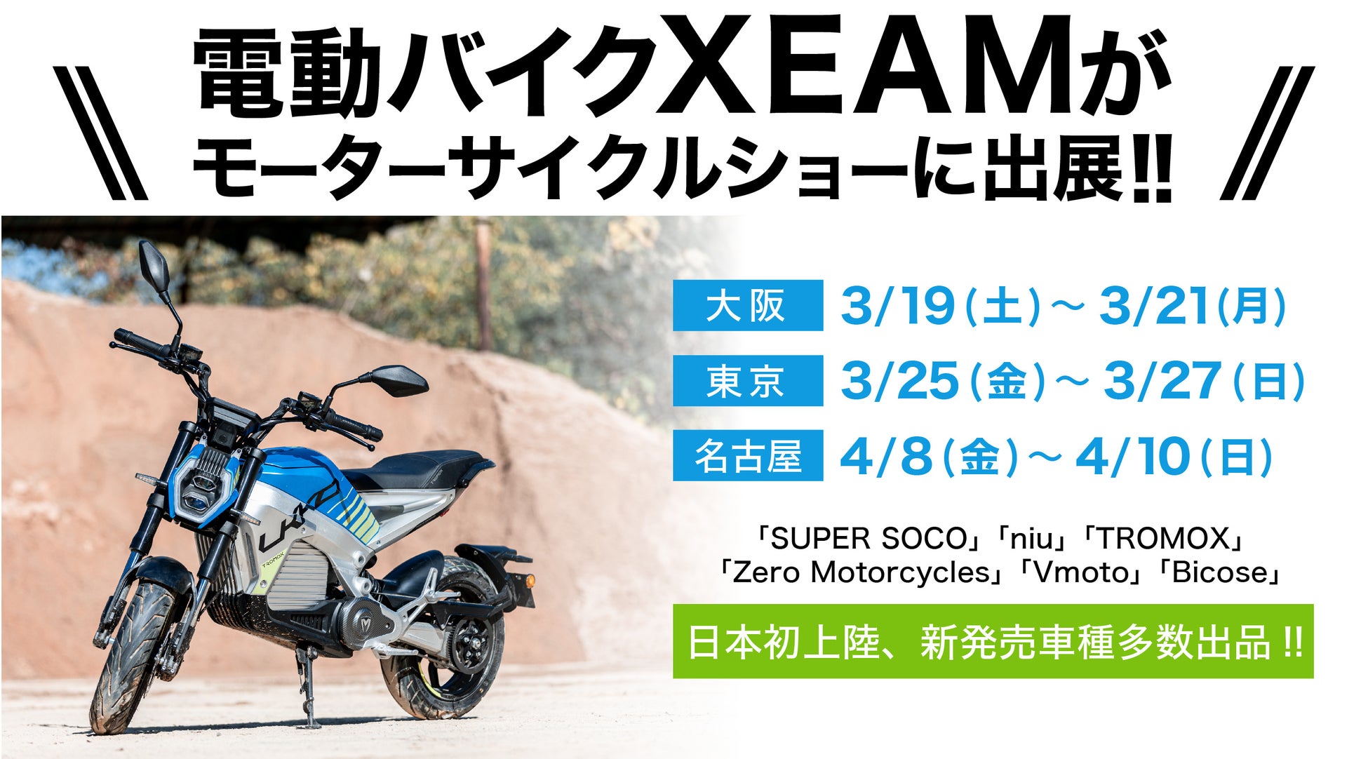 電動バイクXEAM(ジーム)は大阪・東京・名古屋で開催されるモーターサイクルショーに、現在取り扱っている電動バイクブランド「SUPER SOCO(スーパーソコ)」、「niu(ニウ)」、「TROMOX(トロモックス)」、「Zero Motorcycles(ゼロモーターサイクルス)」、「Vmoto(ブイモト)」をはじめ、日本初公開となる電動バイクブランド「Bicose(ビコース)」など計6ブランド20車種を出展します。