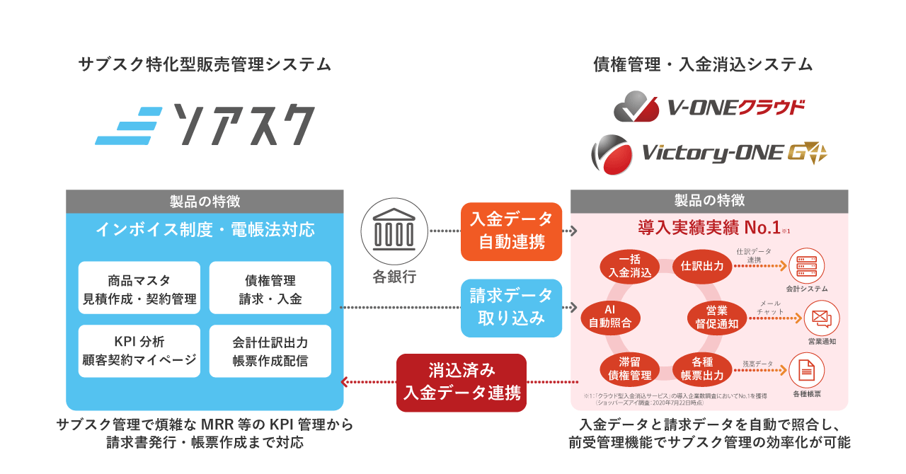 債権管理・入金消込システム「V-ONE」シリーズとBtoBサブスク管理サービス「ソアスク」がデータ連携機能を実装
