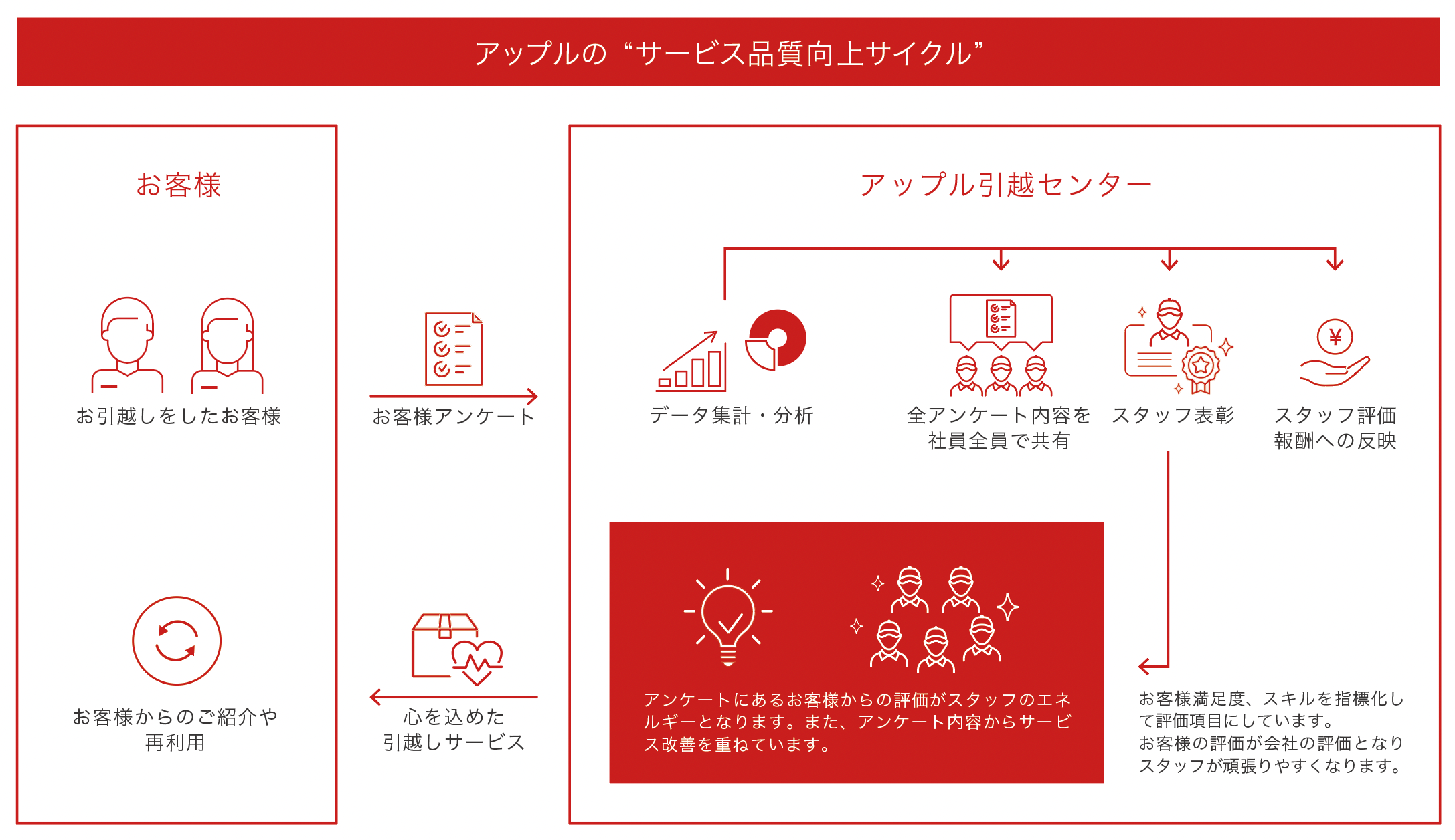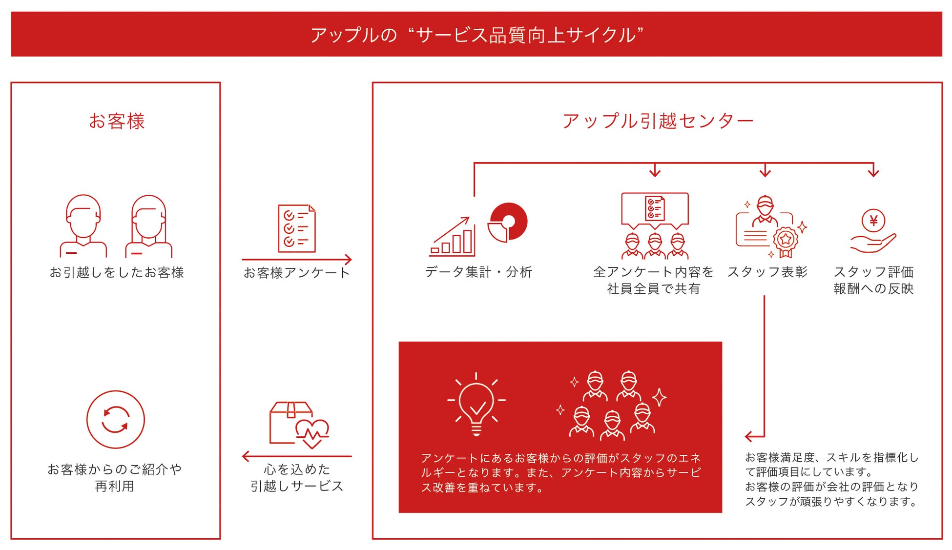良いサービスを提供すればお客様に満足していだけます。引越しは「人」が提供するサービスです。スタッフが良いサービスを提供できるような環境作りが大切だと考えています。お客様アンケートにある評価と会社のスタッフ評価を近づけることで、スタッフが活き活きと頑張り良いサービスを生み出すサイクルを作っています。