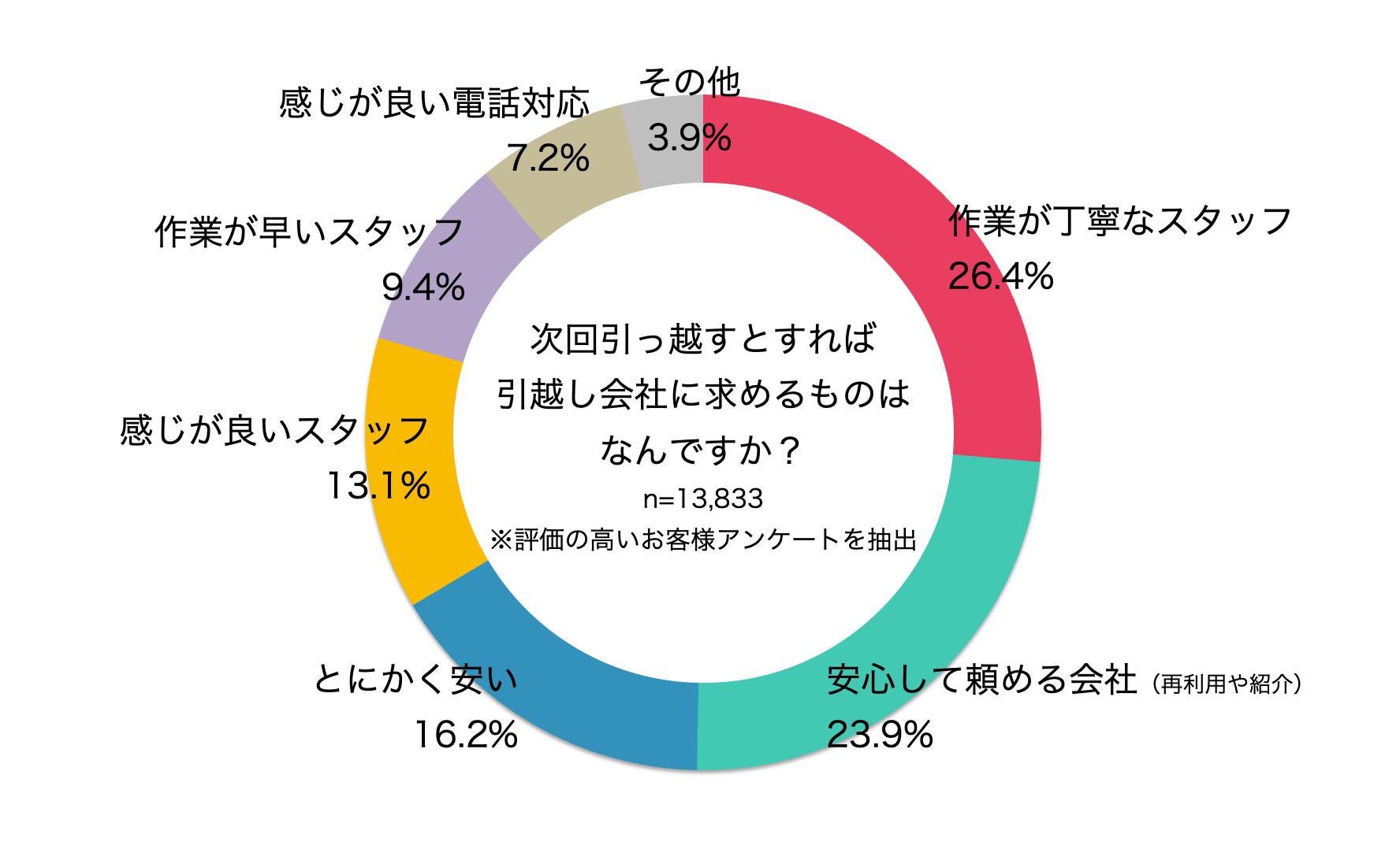例えば「引越しはとにかく安ければ良い」と思われがちですが、実際には「安さよりも信頼や安全」ということが、アンケート結果からわかります。