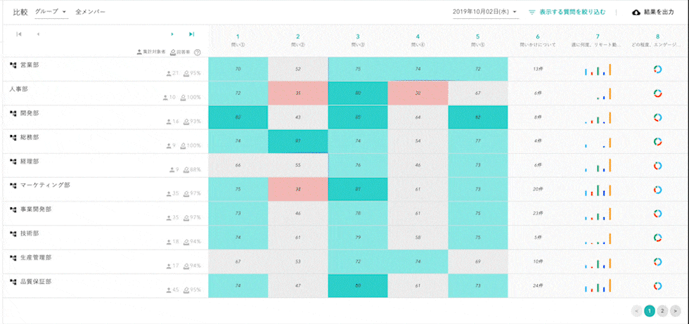 エンゲージメント研究の国内第一人者である慶應義塾大学 島津明人教授の監修に基づき開発されたエンゲージメント解析ツール。”PCやスマートフォンから簡単に回答でき、極めて負担の少ないUI設計”と、導入企業さまからご評価いただく。アンケート結果はリアルタイムで自動集計され、蓄積されたビッグデータと共に解析することで組織ごとの特徴や傾向、課題の特定を可能としている。 現在ビジネス領域のみならず、スポーツや教育の領域でも広く導入が進んでおり、導入組織数は2,140以上、回答データは累計7,300万件を超える。2019 年度グッドデザイン賞を受賞。(2021年11月11日現在)
