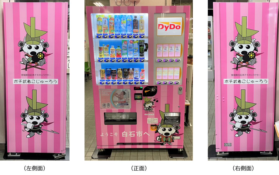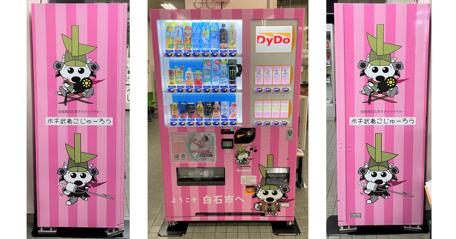 また、本自販機は、白石市PRキャラクター「ポチ武者こじゅーろう」のイラストを施すことで、お子様にも親しんでいただきやすいデザインとしており、飲料や紙おむつを購入する以外の楽しみも提供いたします。