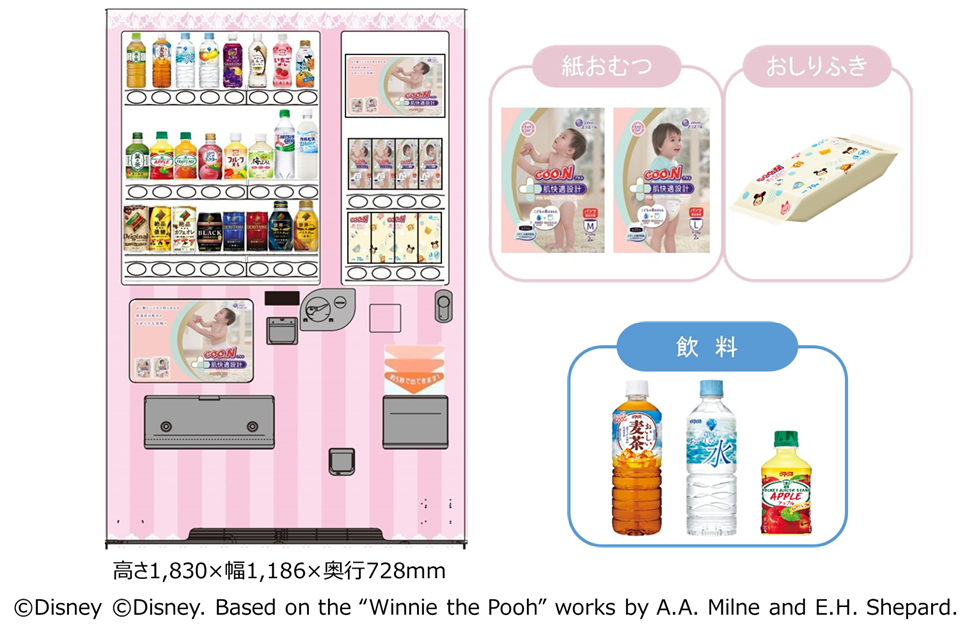 当社では、今後も自販機をご利用されるお客様に、本自販機を通して、子育て世代の方々が安心して外出しやすい環境づくりに向け、応援してまいります。