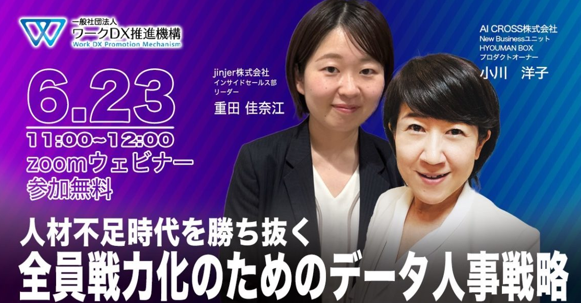 AI CROSS 株式会社(本社:東京都港区、代表取締役CEO:原田典子)は、この度、一般社団法人ワークDX推進機構が主催し2022年6月23日(木)に開催されるオンラインセミナー「人材不足時代を勝ち抜く全員戦力化のためのデータ人事戦略」に登壇することになりましたのでお知らせします。