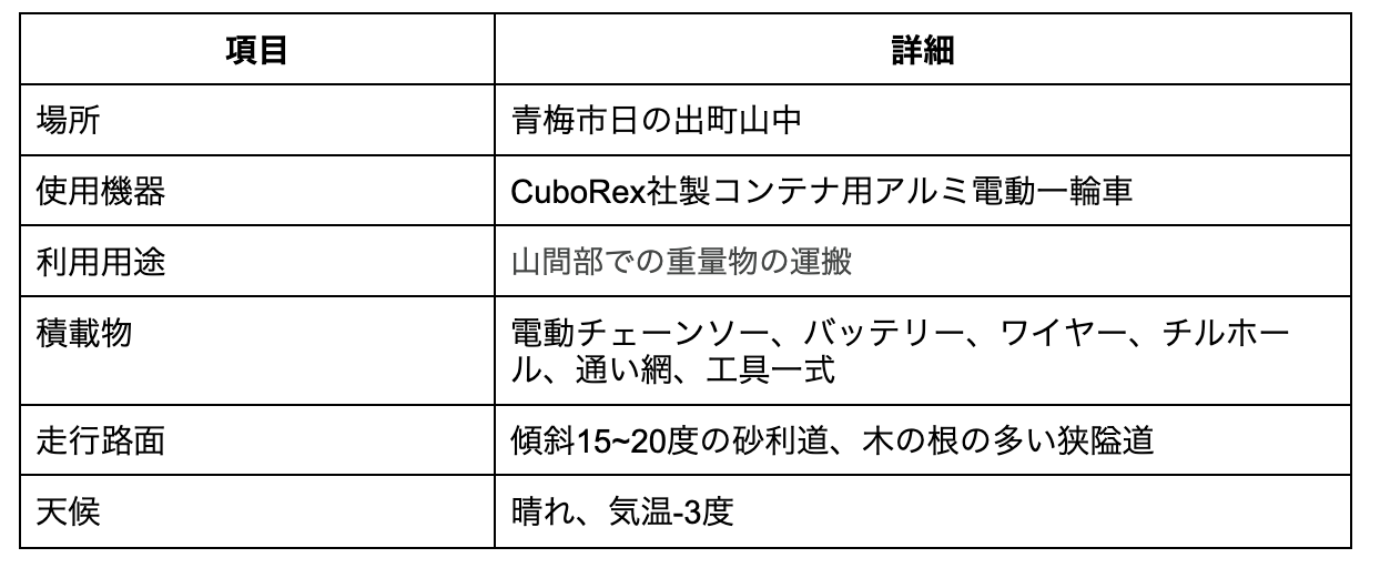 ・作業内容:山間部の断線工事の修繕に必要な資機材の運搬