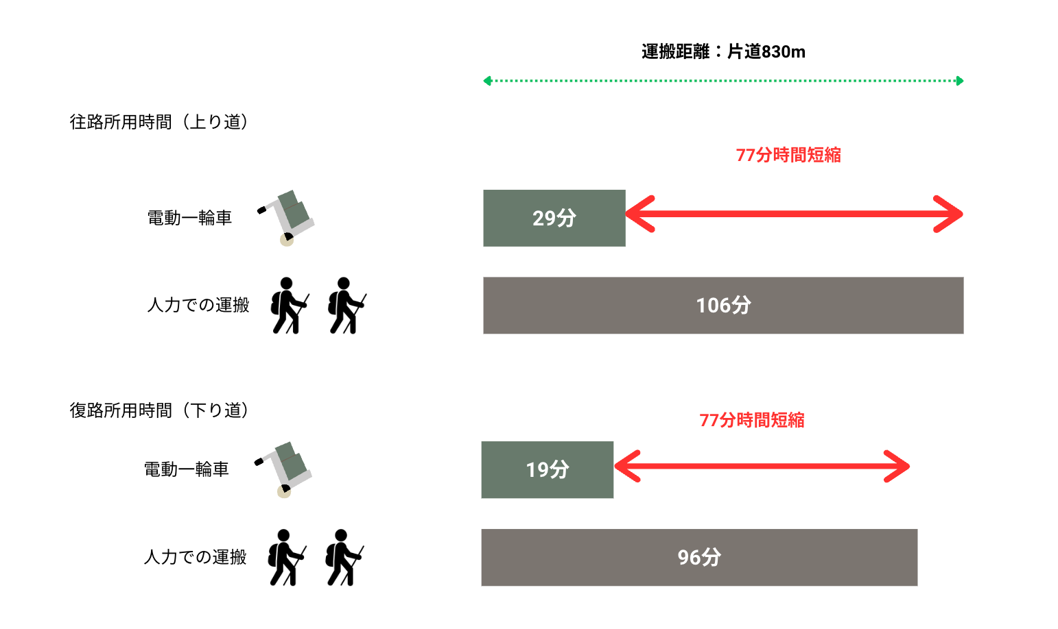 従来の運搬方法である、作業員が背負って運ぶ場合と電動一輪車利用時の差を比較