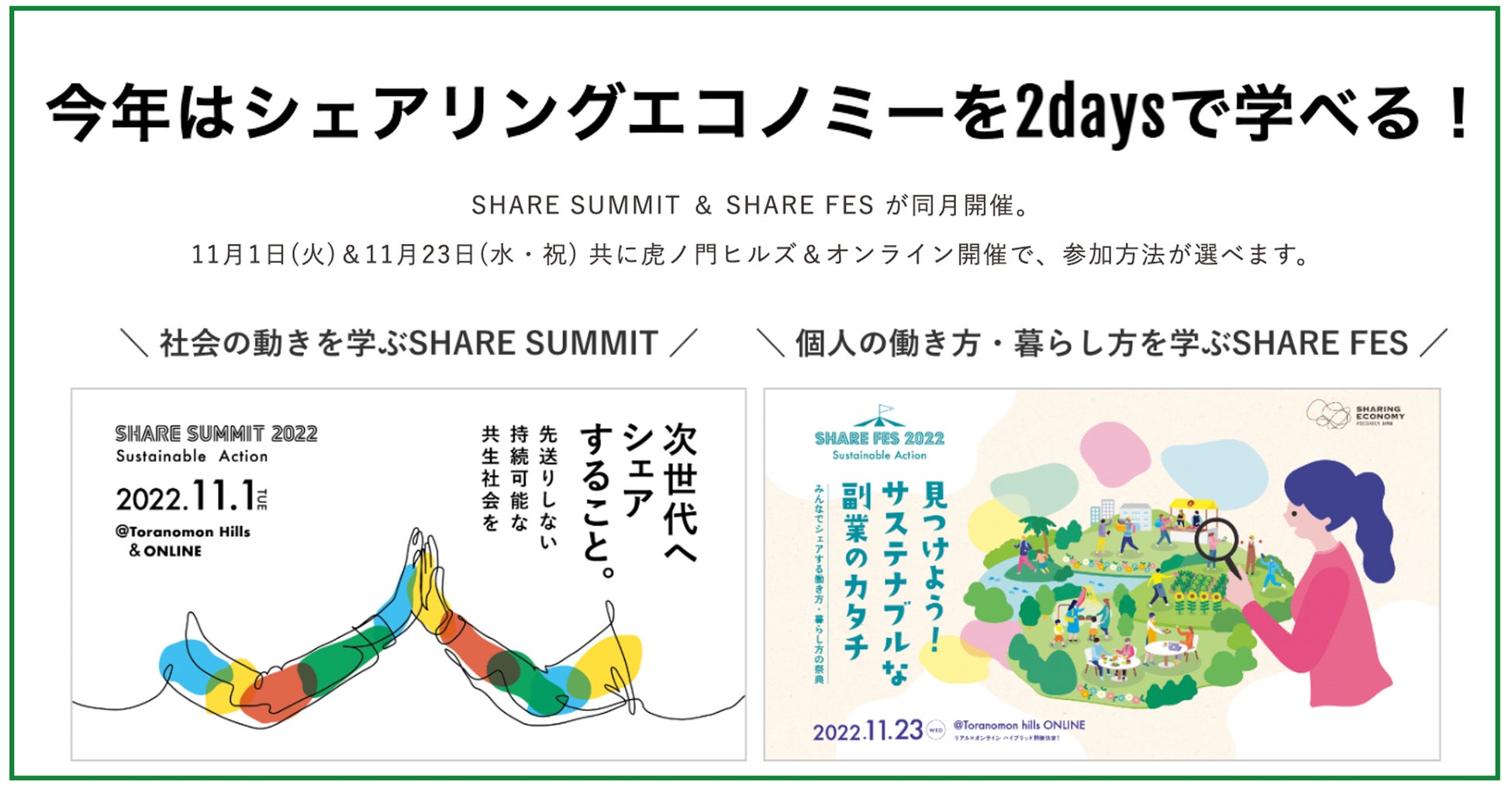 一般社団法人シェアリングエコノミー協会は、2022年11月1日(火) に日本最大のシェアカンファレンス「SHARE SUMMIT 2022」、11月23日(水・祝)にサステナブルな働き方・暮らし方を学ぶ「SHARE FES」を開催します。