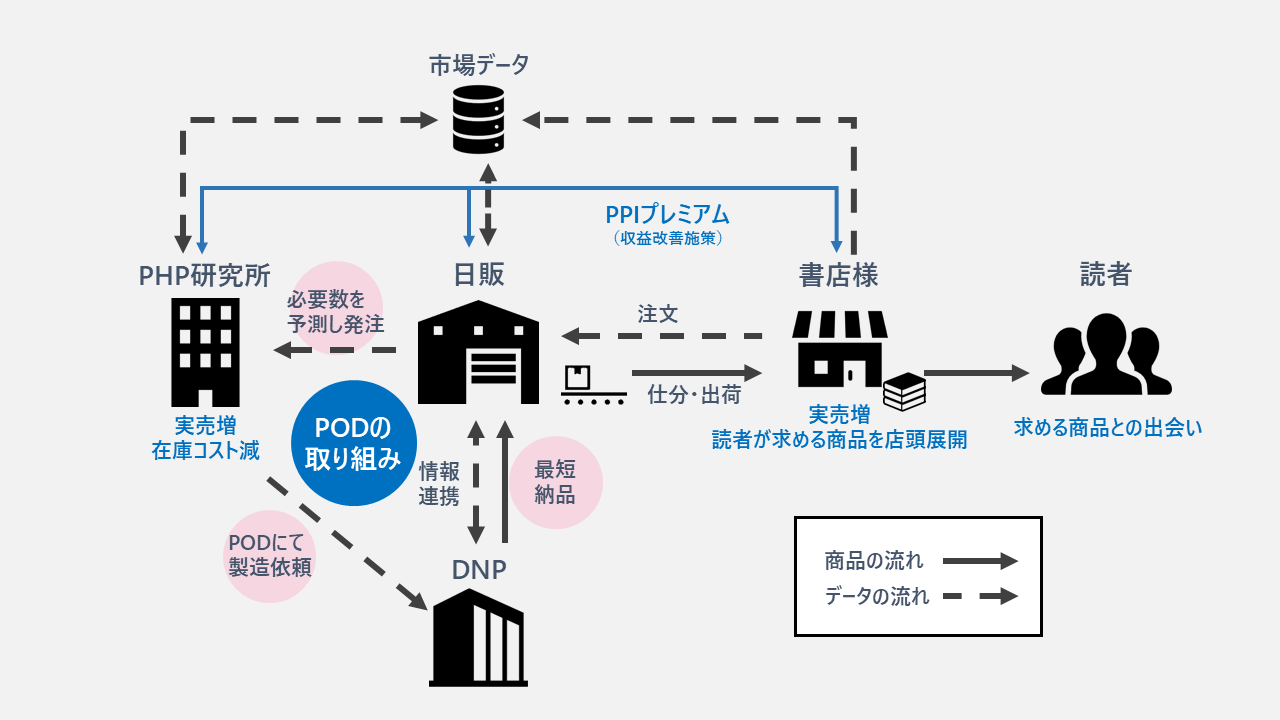 PHP研究所とDNPならびに当社は、出荷率をはじめとする課題のさらなる改善を図るとともに、需要予測の活用なども加え、書店様の収益改善につながる出版流通改革のスキームのモデルを研究し、POD製造の在庫を当社に直接納品していただくなど、より製造・流通の一体化に向けて、取り組んでまいります。
