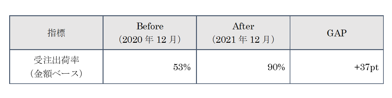 この取り組みの結果、受注出荷率は大幅な改善を図ることができ、90%を実現することができました(下表)。また、出荷金額に換算すると対前年138%と、大幅に増加しました。