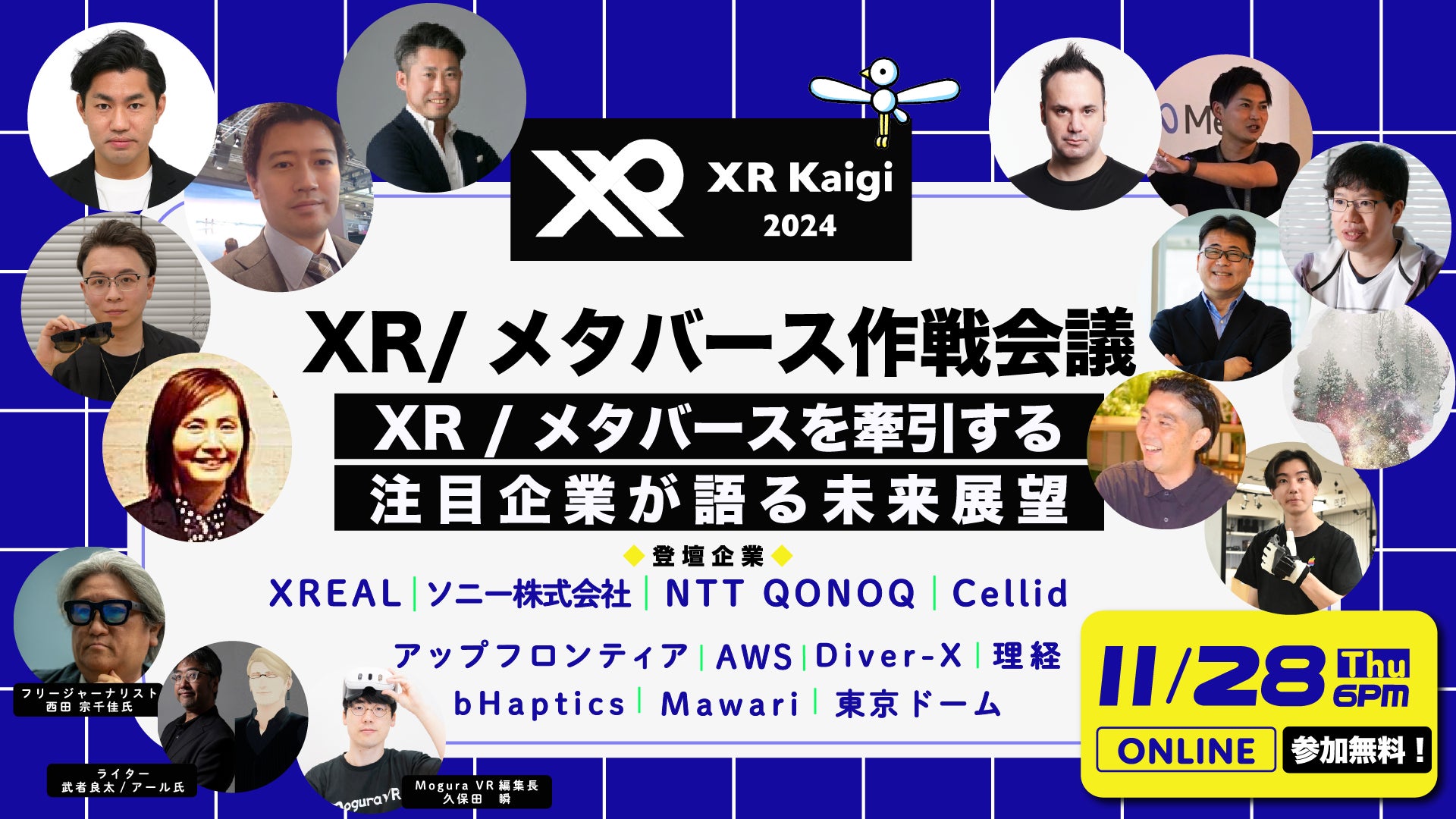 株式会社Mogura(本社:東京都千代田区、代表取締役社長:久保田 瞬)は、国内最大級XR / メタバース カンファレンス「XR Kaigi 2024」に先駆け、スペシャル・プレイベントとして「XR/メタバース作戦会議 ~XR / メタバースを牽引する注目企業が語る未来展望」を11月28日・オンライン開催いたします。