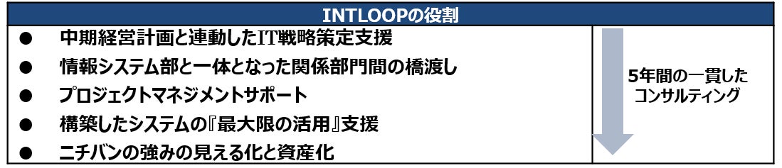 INTLOOPは企画段階から、製品選定・導入パートナー選定、システム実装段階でのプロジェクトマネジメント、運用サポートをこれまで5年間一貫して支援させていただきました。従来ニチバン内で属人化していた「勘」・「経験」・「度胸」を本プロジェクトにおいて資産化し、個人と組織の一体運営を推進しています。現在はニチバンとして初となる海外グループ会社へのITの展開におけるサポートを実施しつつ、新システムの更なる有効活用と業務部門が抱える本質的な課題の発見とその解決策の提案・マネジメントといった幅広い領域でのコンサルティングを実施しております。