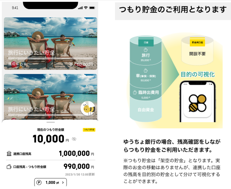 (※)つもり貯金とは、連携銀行口座(貯金元口座)とfinbee貯金口座(貯金先口座)への実際の資金移動を伴わずfinbeeアプリ内で「架空の貯金」としてfinbeeの貯金機能を利用、体験いただける機能です。本来は口座連携をせずに利用いただく機能ですが、ゆうちょ銀行との口座連携においては、参照した口座残高内で貯金の管理ができるようになります。