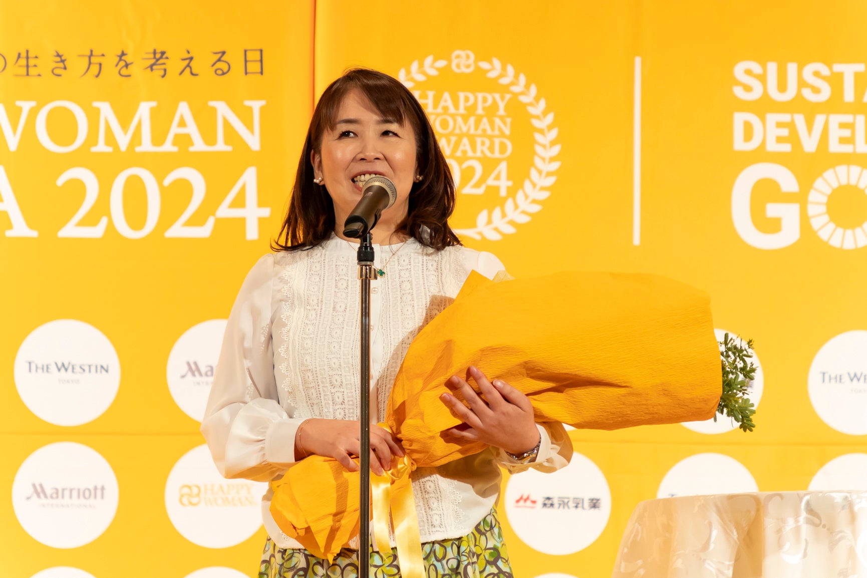 開口一番「これが欲しかったです!」とハッピーオーラ全開。36年前に環境大国であるスウェーデンから来日。日本が大好きだからこそ、日本社会における女性の立場をもっとよいものにしたいと語りました。「ハッピーと勇気は自分の中にあります、それを探し出してください。あなたがなりたい女性になってください」と日本の女性にエールを送りました。自身がナビゲーターを務めるラジオ番組「ALL GOOD FRIDAY」が表彰式の日時と重なり、LiLiCoさんがこの授賞式に参加できるように会場で初の生放送を実施。スタッフへの感謝を述べました。また、数日前に父親が心臓発作で倒れたことを告白。「おめでとう、私のHAPPY WOMAN」と一通のメッセージが届いたと明かし、涙で声を詰まらせました。