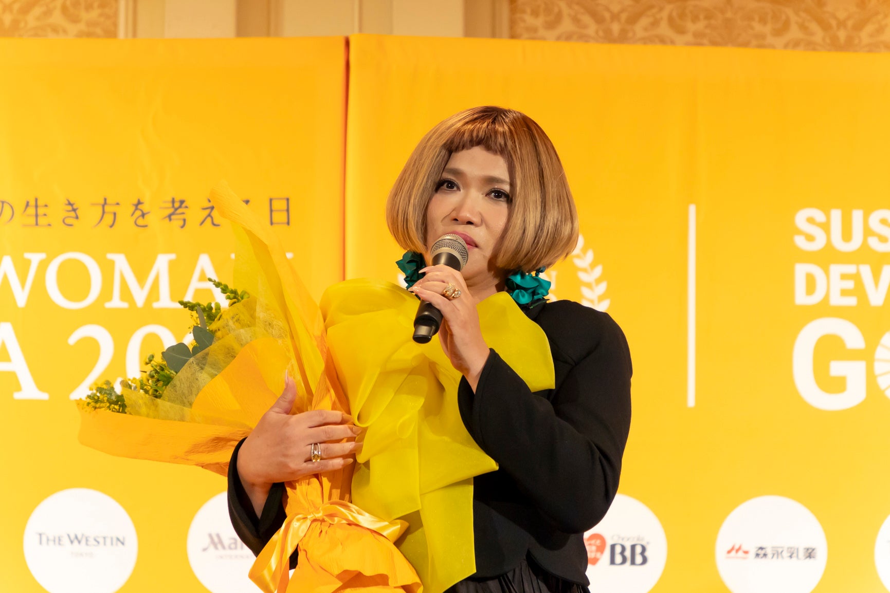 胸元に大きな黄色いリボンをあしらったブラックドレスで登場。受賞の内定を聞いたときは「どんだけーーーー!」と叫ぶぐらい嬉しかったと語りましたが、女性として表彰されるまでに至る道のりは険しいものだったとも伝えました。「女性の地位向上を願って、ボーダーレスな時代にしていくことを目指してきましたが、思えば自分の人生は垣根だらけだった気がします。垣根があるということで、自分を愛せない自分が、かつてはたくさんいたと思う。願っていたのはただ、違和感のない女性になること。それがこの賞をいただいて、今まで少しでも女性として認められたのかな、1mmでもボーダーを超えられたのかなという気がして、本当に嬉しかった。今年62歳になったのですが、この自分の人生を誇りに思います」と目を潤ませました。