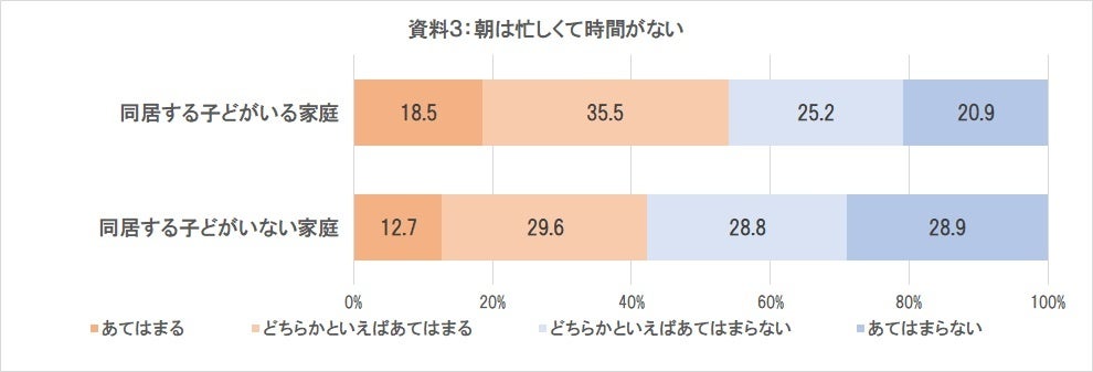 日常生活について、「朝は忙しくて時間がない」と感じる人が、子どもがいる家庭では、いない家庭と比較して、「あてはまる」、「どちらかというとあてはまる」の回答が11.7ポイント高くなりました。(資料3)