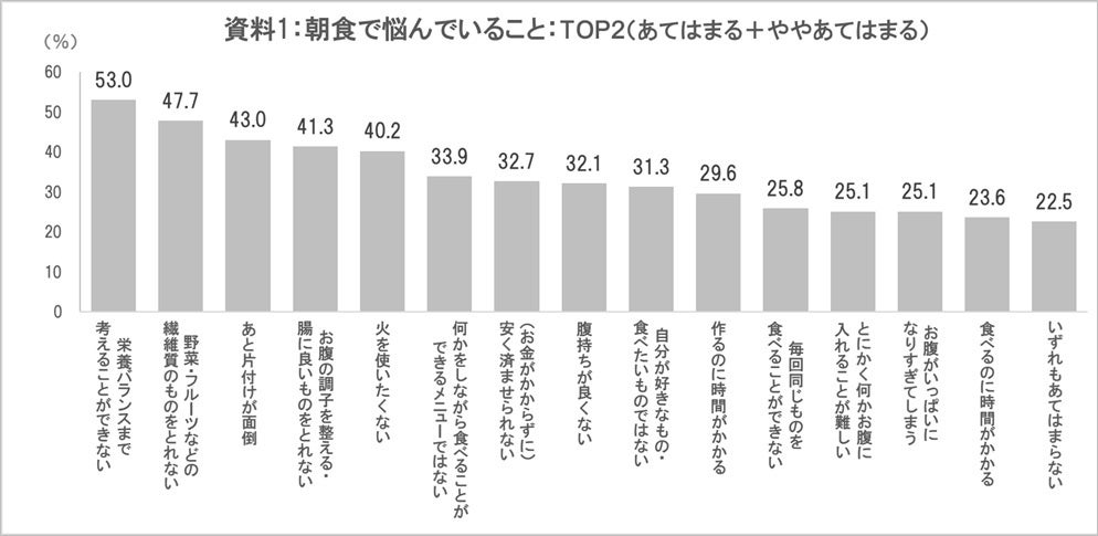 「朝食で悩んでいること」は、14項目中多い順に「栄養バランスまで考えられない」 53.0%、「野菜・フルーツなどの繊維質のものをとれない」47.7%、「あと片付けが面倒」43.0%、「お腹の調子を整える・腸に良いものをとれない」41.3%、「火を使いたくない」40.2%が上位5項目となり、栄養面と準備・あと片付けの手間に多くの人が悩んでいることが分かりました。(資料1)