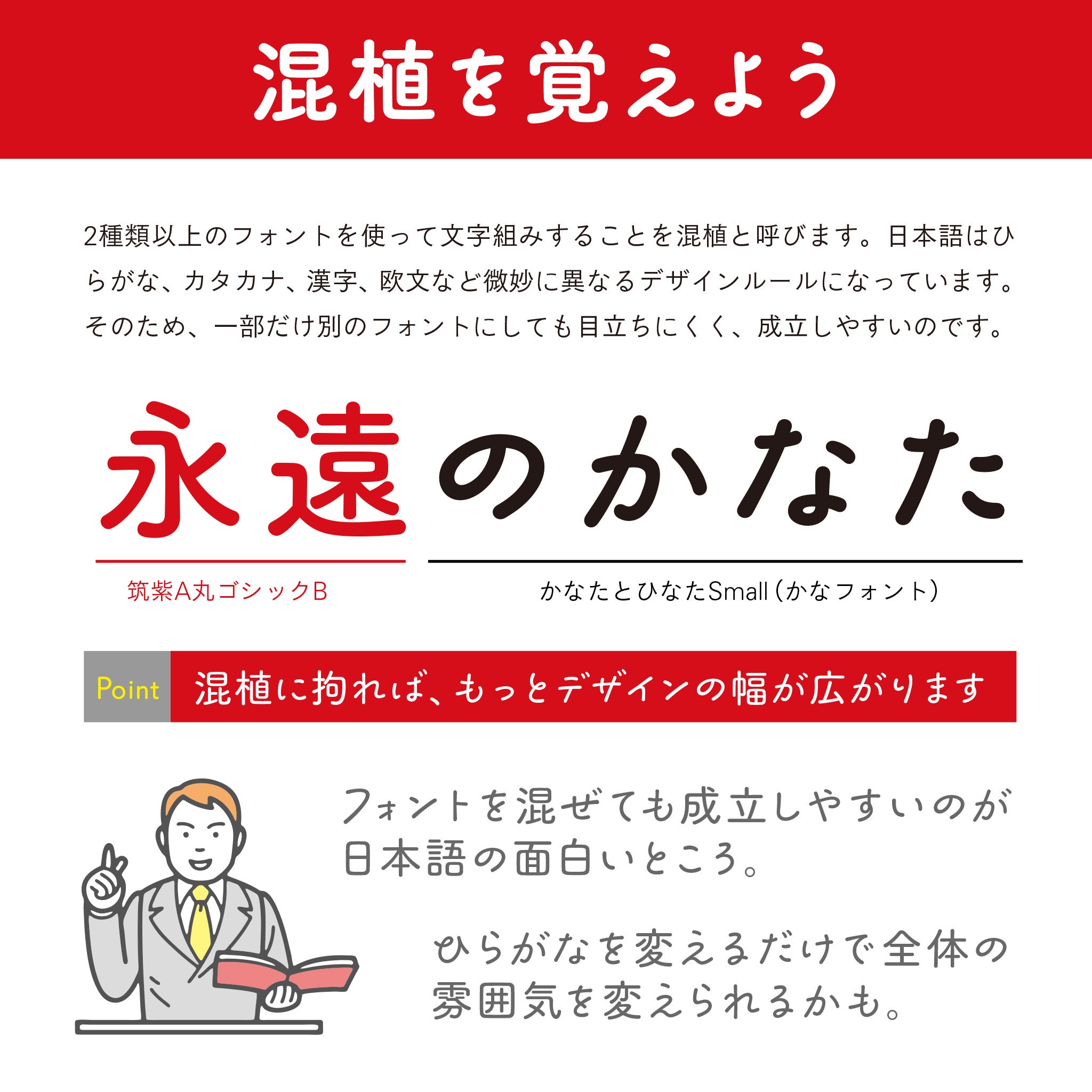 また本タイアップを記念して、フロップデザイン代表・加藤雅士氏に、混植フォントを分かりやすく説明した Tips 画像を制作いただきました。混植の基本のキからはじまり、今回ご提供いただいた書体とフォントワークス書体の混植例も紹介しています。