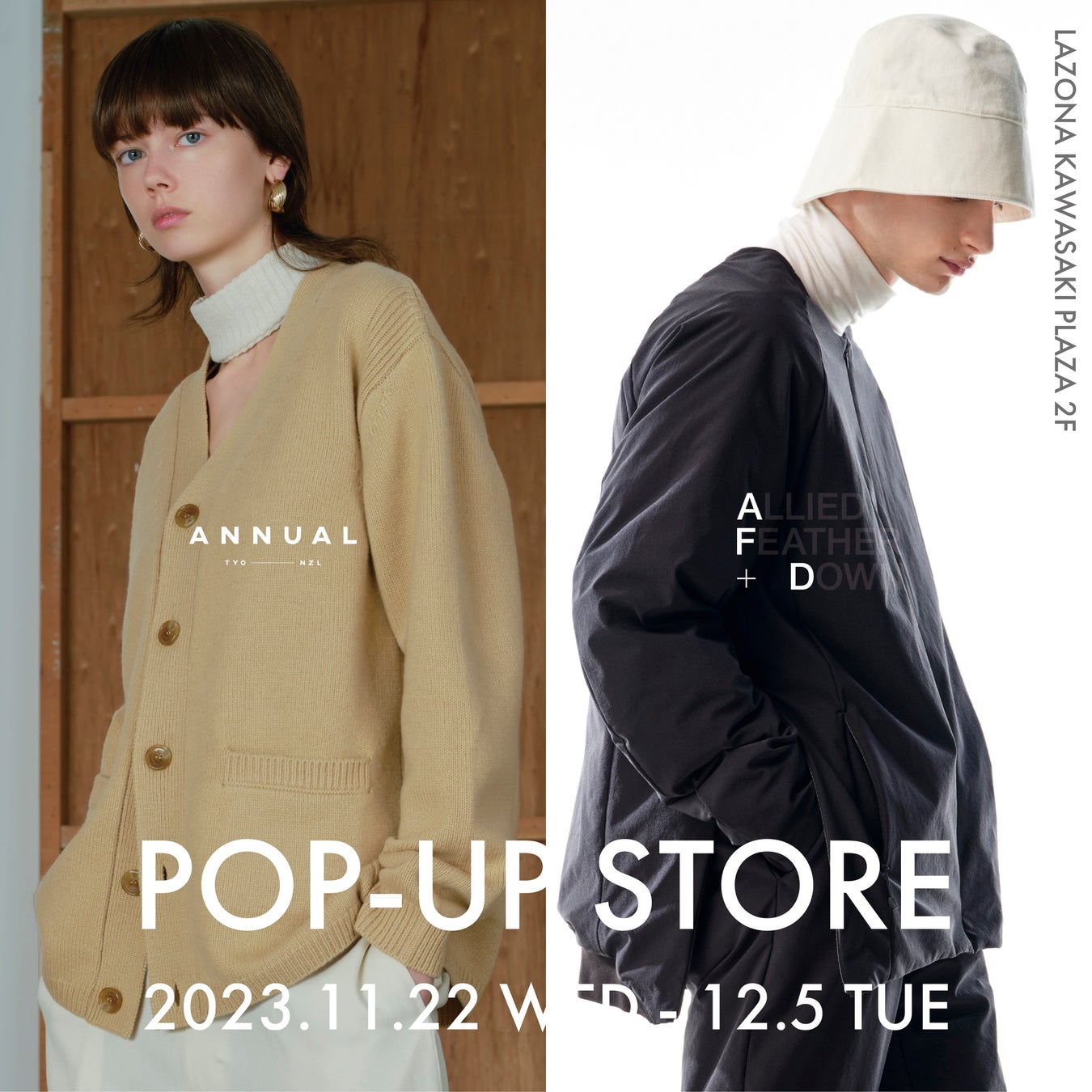 MNインターファッション株式会社(本社:東京都港区 代表取締役社長:木原伸一)が展開するダウンウェアブランド「ALLIED FEATHER + DOWN(アライドフェザーアンドダウン)」とニットウェアブランド{ANNUAL(アニュアル)」が2023年11月22日(水)から12月5日(火)までラゾーナ川崎にて限定でポップアップショップを開催しております。
