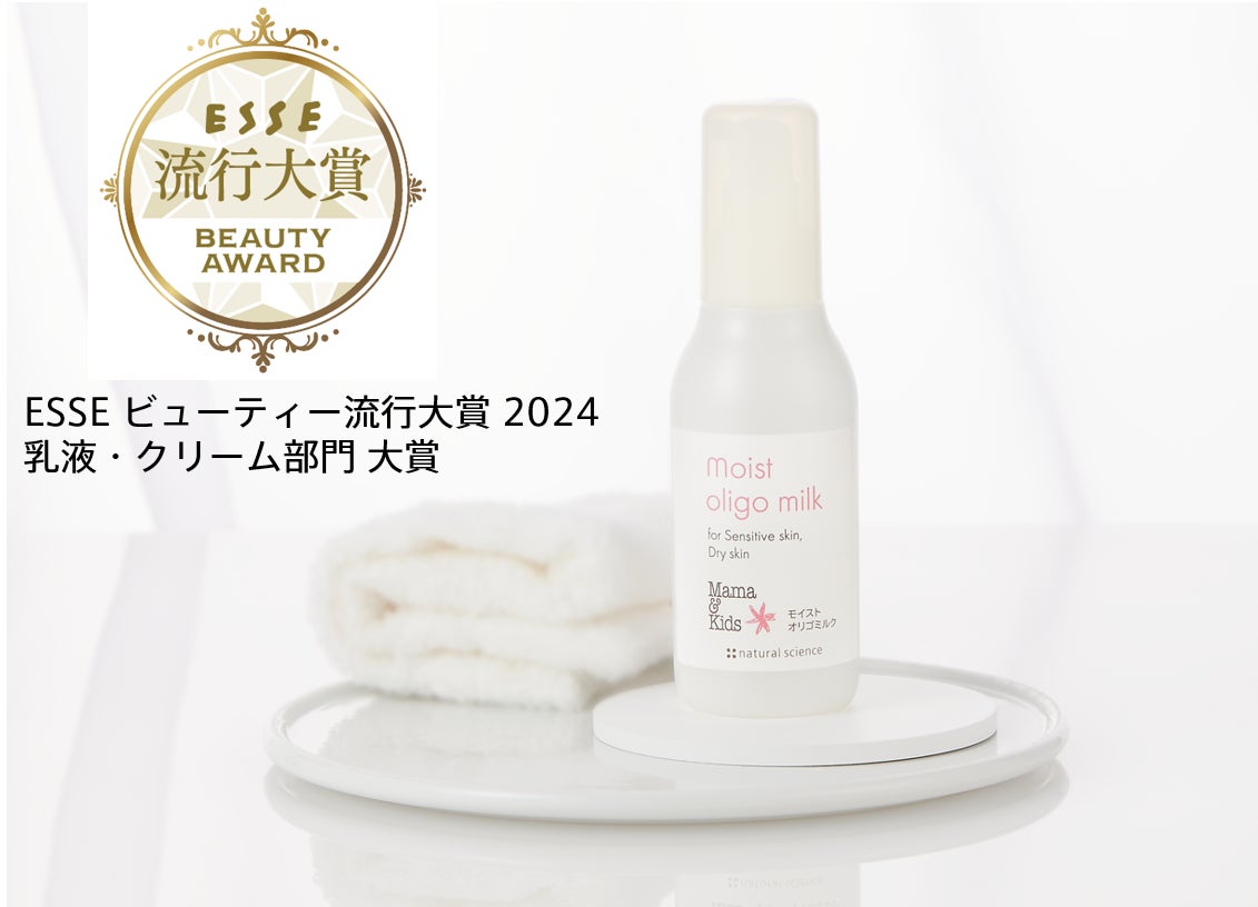 低刺激スキンケアメーカーのナチュラルサイエンス(本社:東京都中央区、代表取締役社⻑:⼩松令以⼦)では、主力ブランド「ママ&キッズ」の人気アイテム「モイストオリゴミルク」が、扶桑社の⽣活情報誌「ESSE」の⼈気企画「ESSE ビューティー流行大賞 2024」の乳液・クリーム部門にて大賞を受賞いたしました。