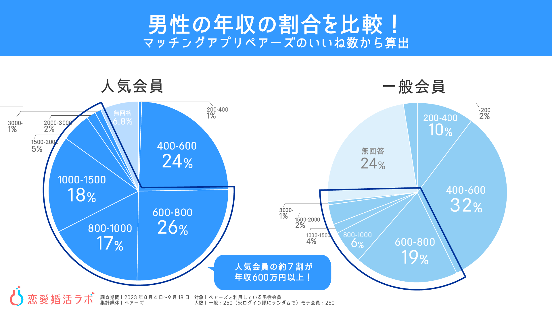 調査結果によると、人気男性会員は「27歳」次いで「32歳」がモテピーク、そして「25歳」から人気に。年収は「年収600万円〜800万円台(25.6%)」、平均身長は「176. 8cm」、身長が「175cm以上」の人気会員は「75.6%」という結果になりました。