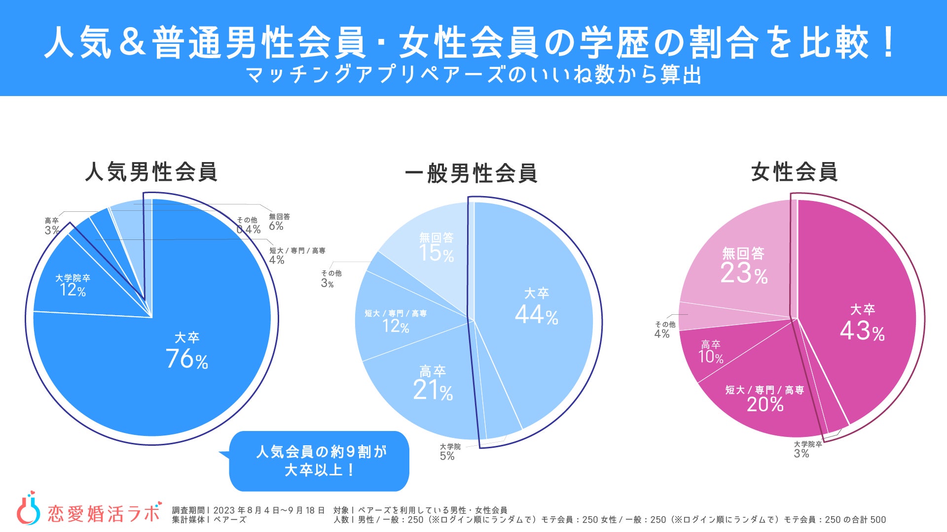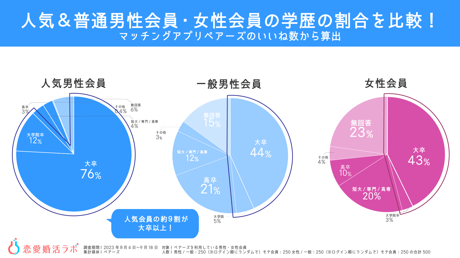 また女性会員500人の調査では(人気女性会員:250人、一般人気女性会員:250人)約半数が「大卒以上」となっており、男性会員にも学歴を求めている傾向があるとうかがえます。