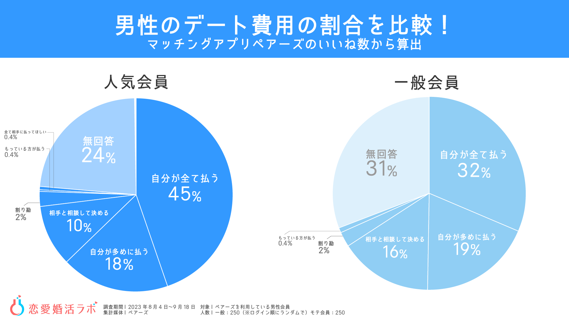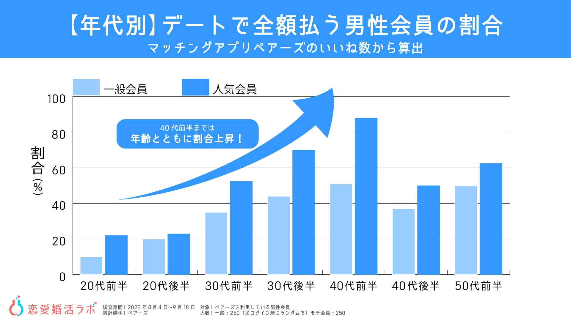さらに、「ペアーズ」の男性人気会員トップ250人と一般会員250人について、年代別で「デート費用」を「自分が全て払う」会員を調査したところ、年齢ごとに全額払う人が増加していることがわかりました。「30代後半」の男性人気会員の約7割、「40代前半」の約8割以上は「自分が全て払う」となっており、「30代辺り」から金銭的にも余裕が出てくることや、年齢が上がるにつれ「デート費用」を払うことを条件にしなければ、いいね数が増えないことなどが結果から考えられます。