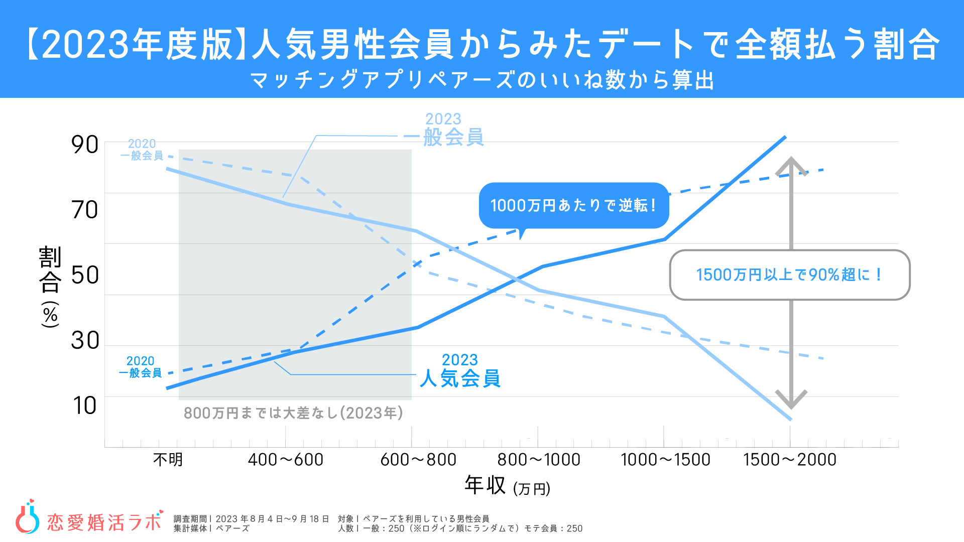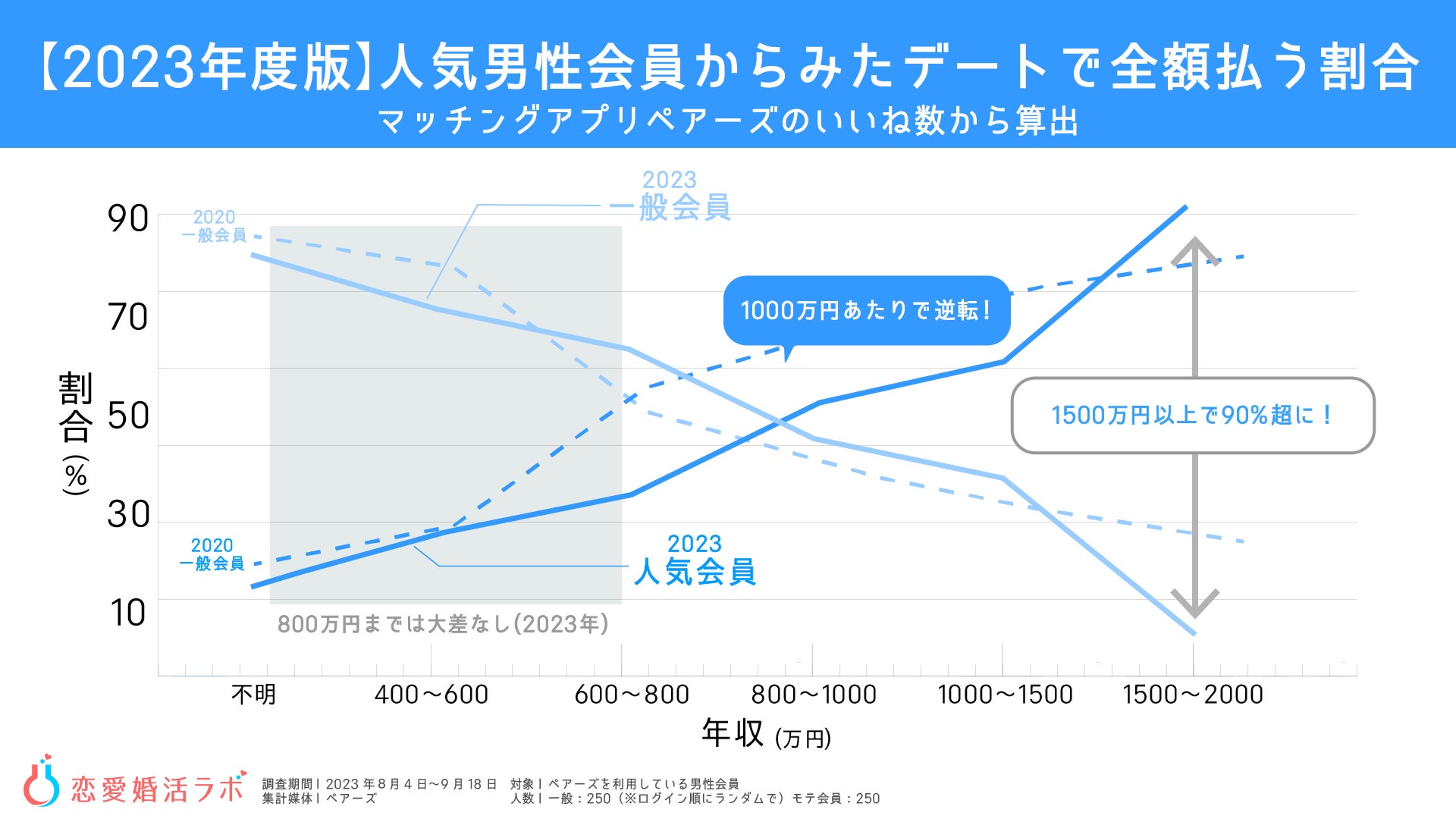 2020年のコロナ禍におこなった調査(※7)では、「デート費用を全額払う」人が多く、逆転しているのが「600万円~800万円台」であったのに対して、2023年度では「800万円~1000万円台」で逆転していることが判明しました。