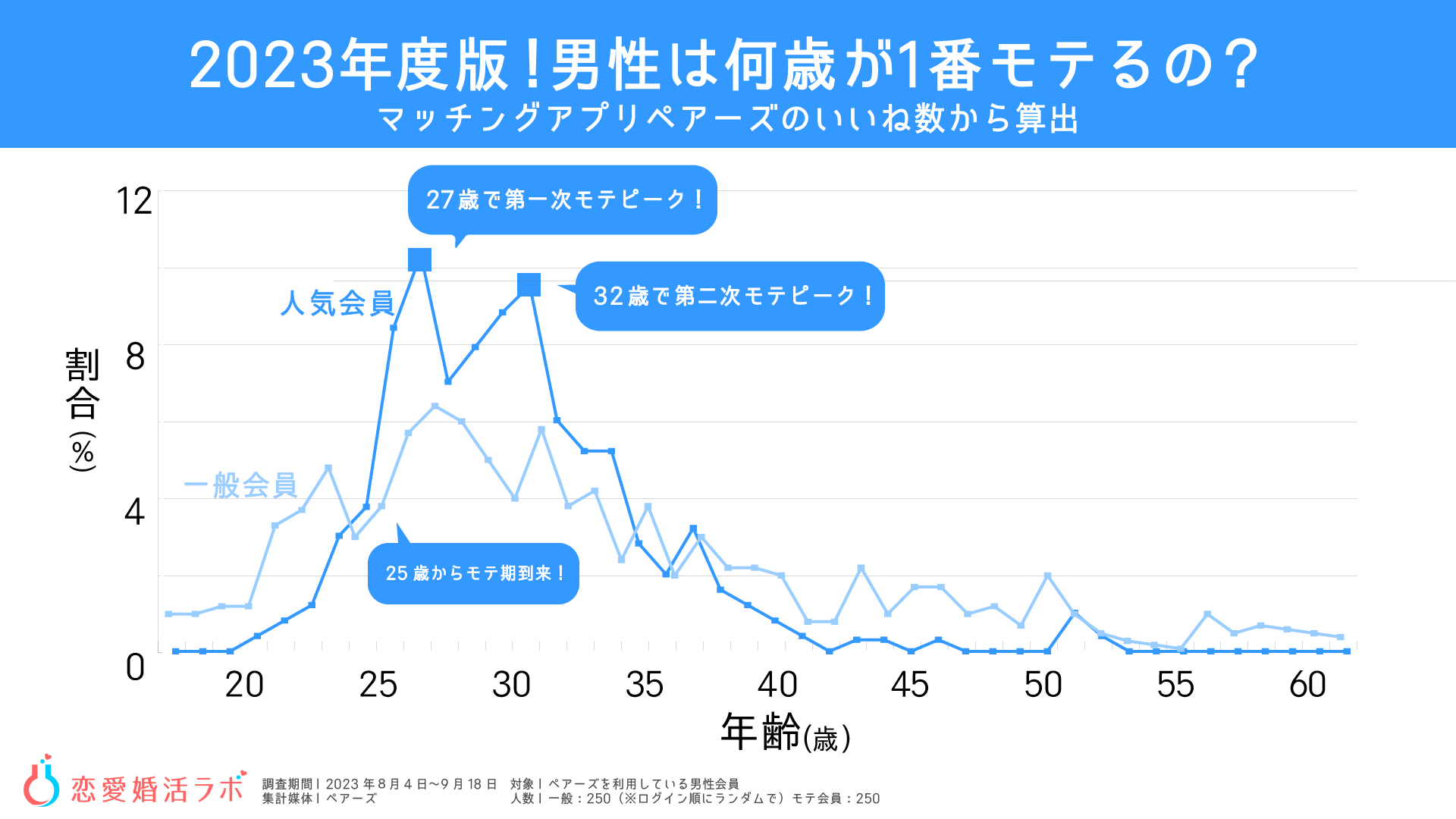 ※1:「男性のモテは「32歳頃」がピーク!!未婚女子に人気の男性会員をマッチングアプリで大調査」https://prtimes.jp/main/html/rd/p/000000010.000025460.html