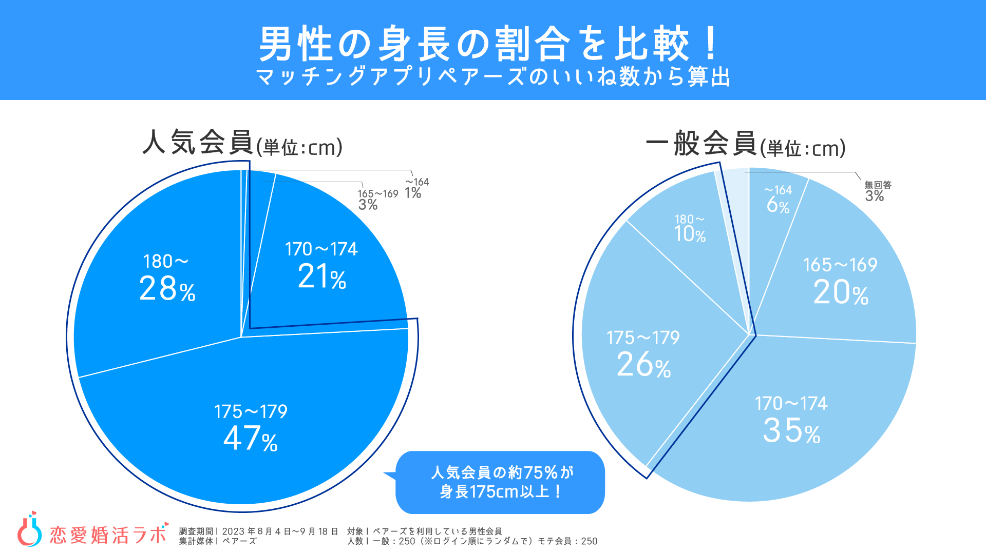 「ペアーズ」の男性人気会員トップ250人について、「身長」の項目を調査したところ、最も多かったのは「170cm~179cm台」で46.8%でした。2021年におこなった、文部科学省の学校保健統計調査によると17歳時点での日本人の平均身長は「170.8cm」(※6)の一方で、男性人気会員の平均身長は「176. 8㎝」となっており、身長が高い男性ほど、人気会員になることがわかりました。また人気男性会員と一般会員を比較すると、人気男性の身長「175cm以上」の会員が約2倍ほど差をつけており、この結果からも高身長男性は未婚女性からモテることが調査結果としても出ています。