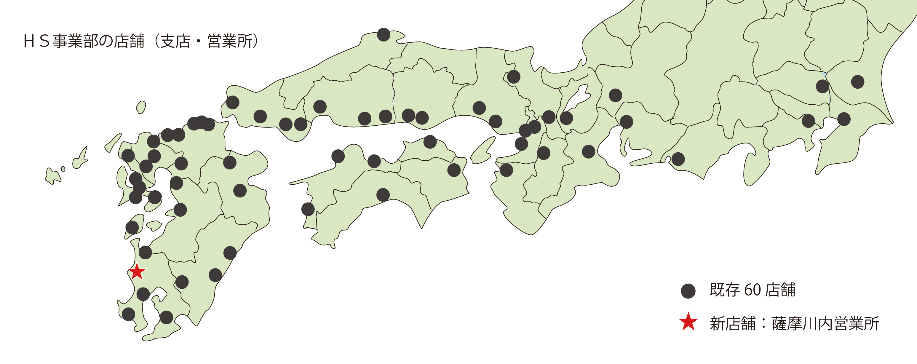 HS事業部は、シロアリ消毒(約82万戸の施工実績)や床下換気、家屋補強や耐震改修など、戸建住宅向けサービスを提供しています。新店舗開設後の総店舗数は、61ヵ店となります。