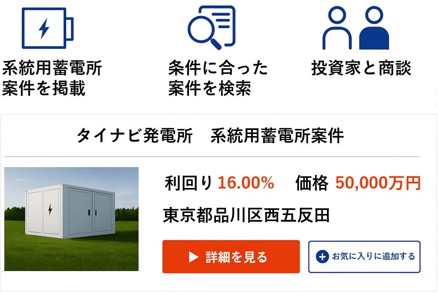 このような市場動向を受け、投資家と施工販売会社の間で適切なマッチングの場が不足しているという課題が浮上しています。「タイナビ発電所」は、系統用蓄電所案件の掲載を可能にすることで、投資家が効率的に案件を検索・比較・購入できる環境を提供し、系統用蓄電池市場の活性化を促進します。