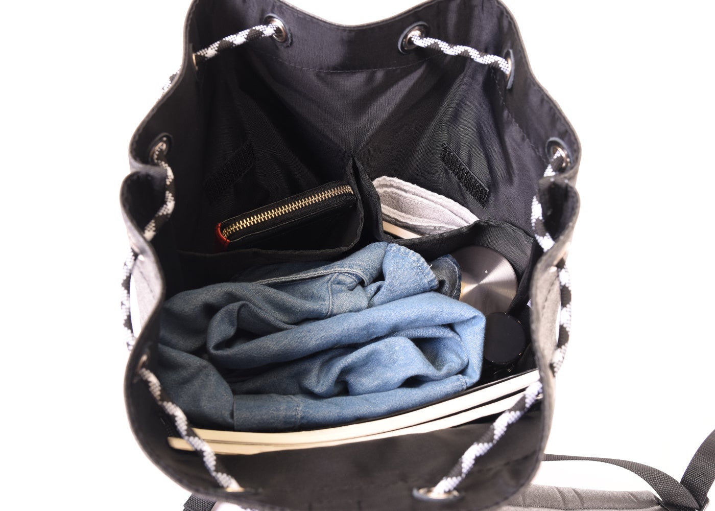 両サイドにはポケットを配置し、巾着式の広い開口部により、中身へのスムーズなアクセスを実現。日常使いはもちろん、アウトドアやバイクシーンにも最適なアイテムです。また、底面にタイヤチューブ素材を採用しているため、汚れた地面に直接置いても気にせず使用できます。