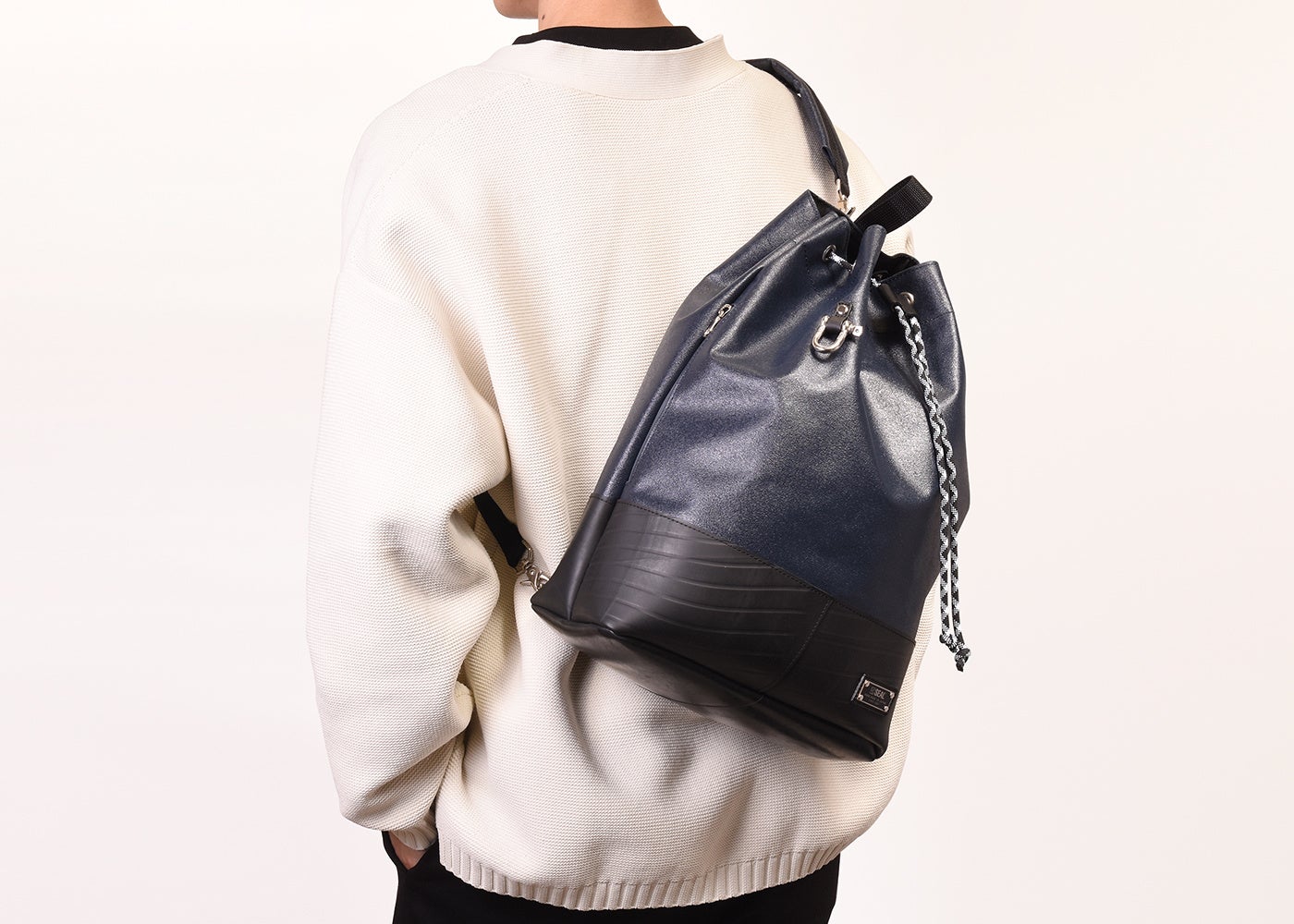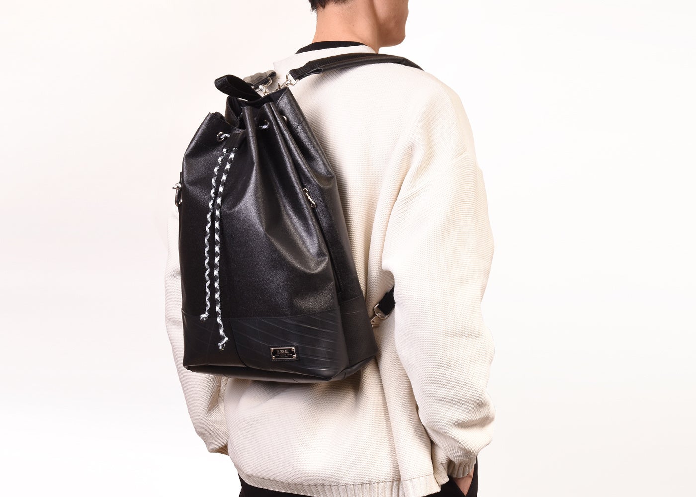 本製品は、上部に森野帆布素材、下部から底面にかけて廃棄されたタイヤチューブ素材を組み合わせた「クロスボディリュックバッグ」です。リュック、ボディバッグ、また手持ちとさまざまなシーンに対応します。