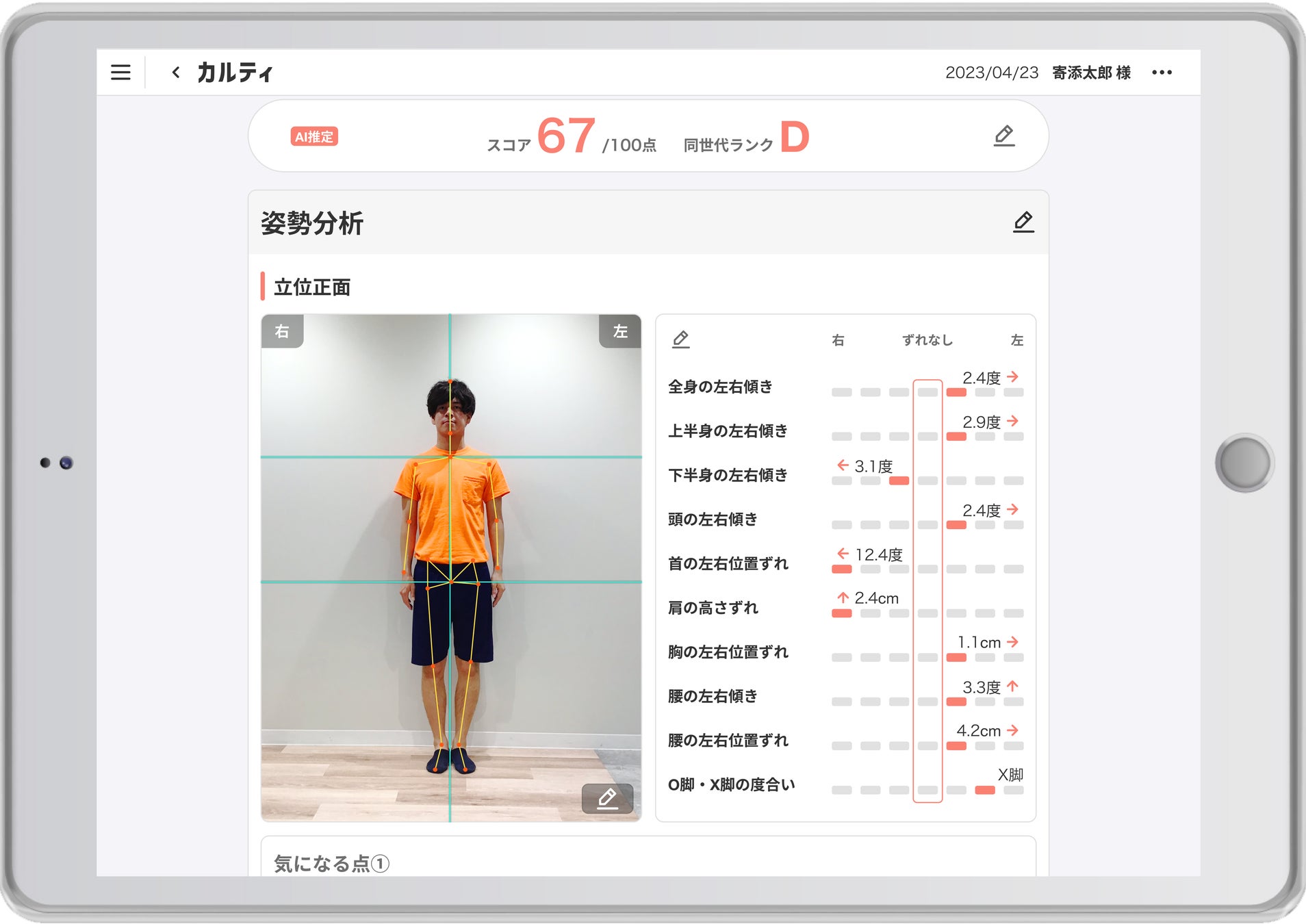 「カルティ シセイカルテ」は、タブレットで数枚の写真を撮影するだけでAIが姿勢を分析し、スコアやグラフで可視化するシステムです。健康経営やカウンセリングなど、さまざまな現場で活用が広がっています。さらに、歩行動画を撮影することで、歩行速度や歩幅、バランスなどの客観的な指標を数値化し、歩行スコアや転倒リスクの評価も可能です。