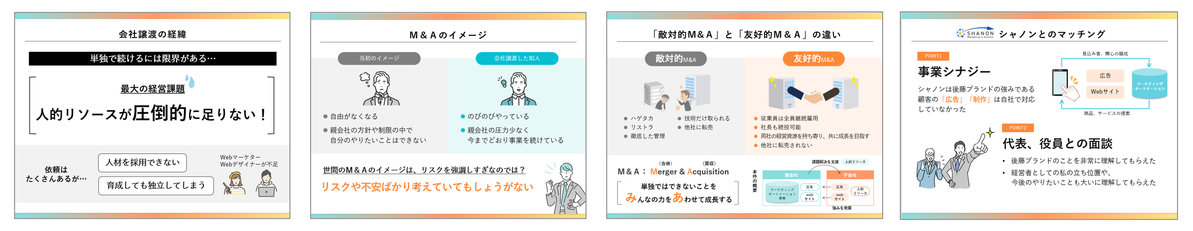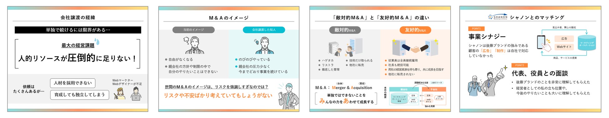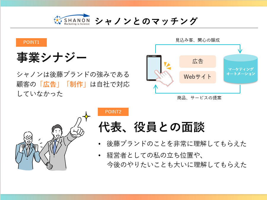 後藤社長は、依頼案件が増えていく中で「人材不足」に大きな課題を感じていらっしゃいました。自社単独の努力だけでは限界があることから、昨年6月、株式会社シャノン(東証グロース上場)とM&Aを実施。相乗効果により人材課題を短期間で解決するとともに、譲渡後も引き続き「代表取締役」としてさらなる事業成長を実現されています。M&Aの検討経緯や、相手選びのポイント、譲渡から10か月経った今の状況をお話しいただきます。
