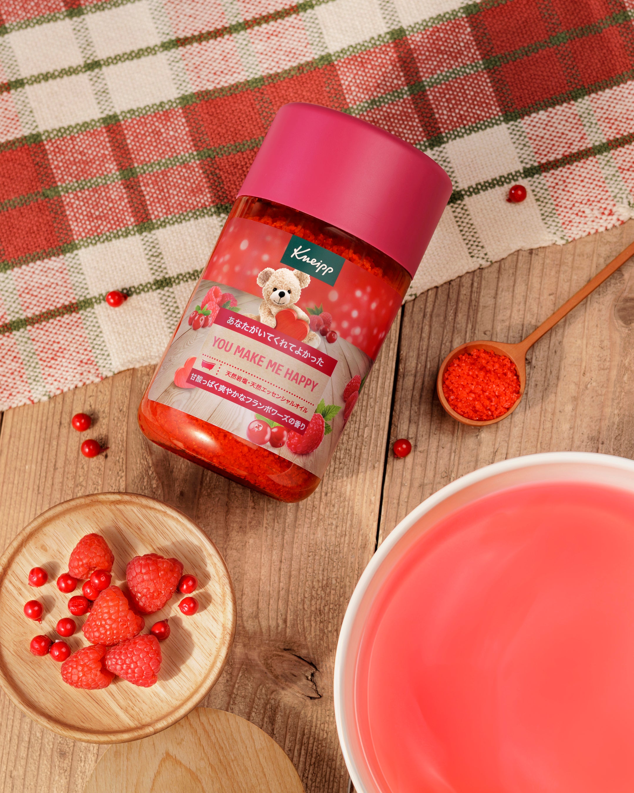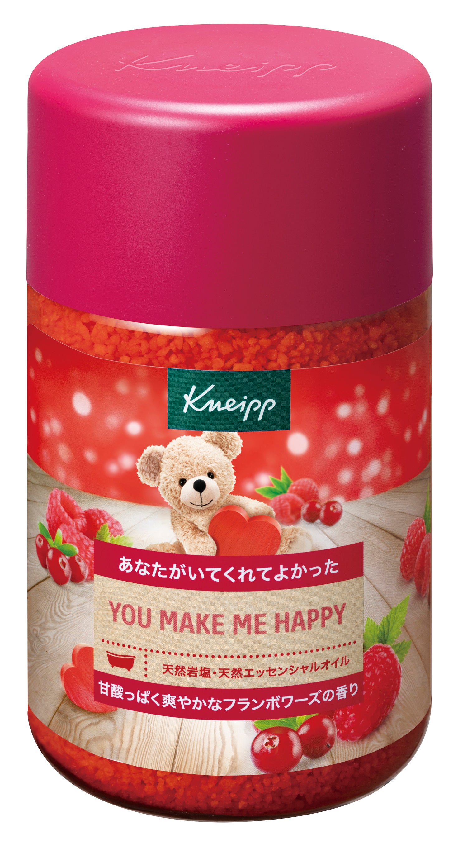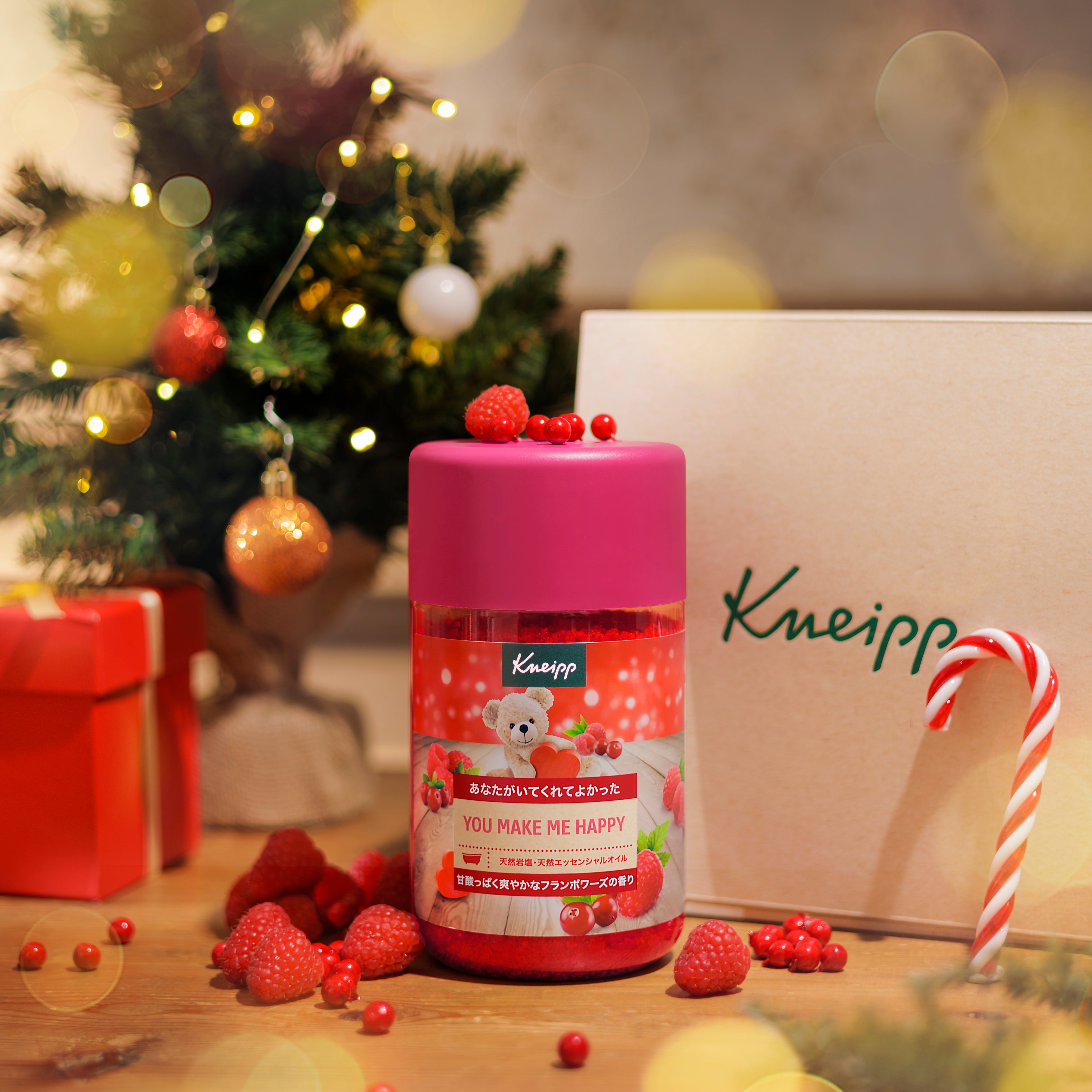 毎年12月に登場し、クマの可愛いパッケージと心あたたまるメッセージが人気の「クナイプメッセージ シリーズ」は、「今年も楽しみに待っていました」「メッセージに励まされた」「プレゼントにぴったり」などの沢山のお声を毎年いただいています。そして、この冬新たに待望の新しい香り、甘酸っぱく爽やかな「フランボワーズの香り」のバスソルトがシリーズに仲間入りします。ラズベリー*1とリンゴンベリー*2から抽出した天然植物成分を贅沢に配合し、まるで朝摘みベリーのようにみずみずしく、つややかな肌へと導いてくれます。バスルームいっぱいに広がる甘酸っぱくフルーティで華やかな香りは、甘く幸せな気分をもたらし、バスタイムを心から満たしてくれるでしょう。