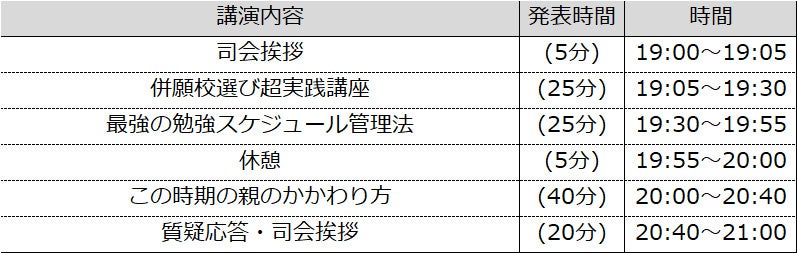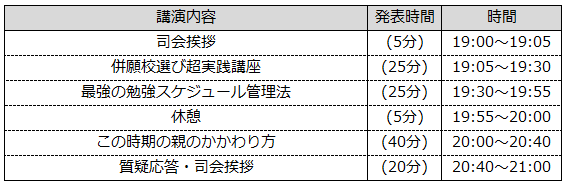 テーマは、出願直前の今、一番求められている「学校選び」、そして学年別にアドバイスする「最強の勉強スケジュール」です。セミナーは以下の3部制となっています。