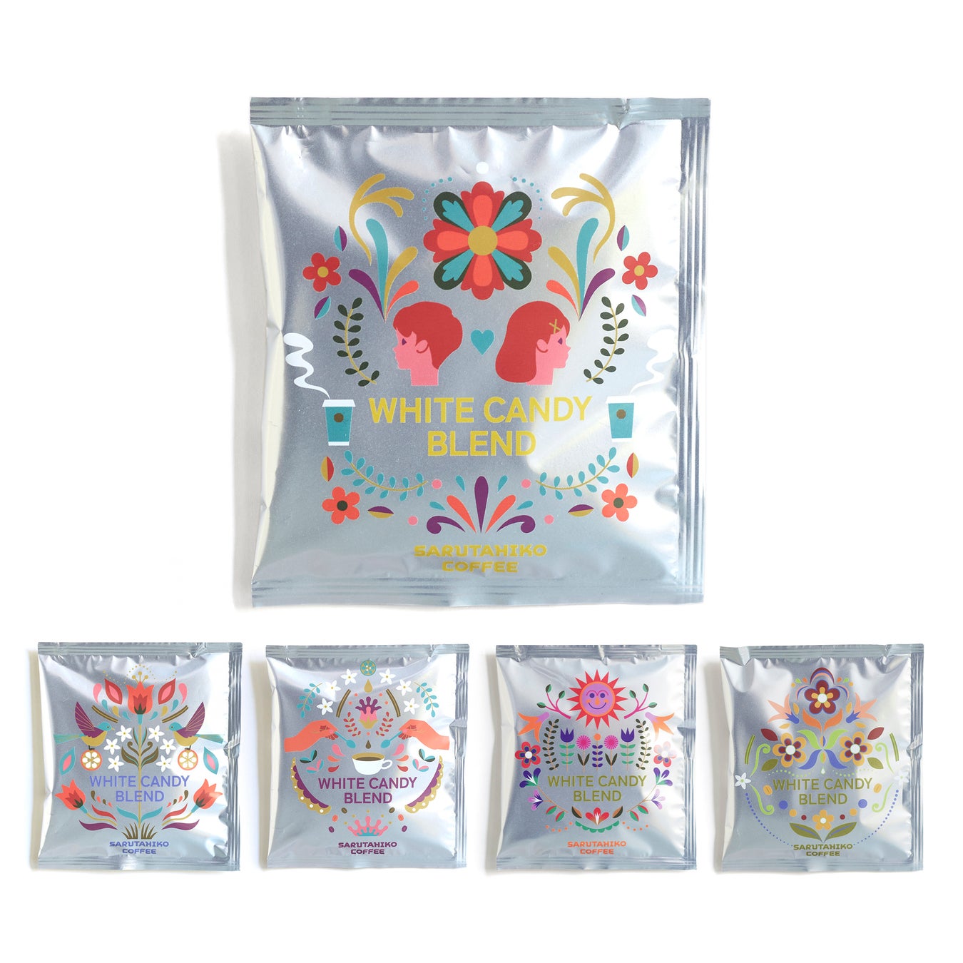 5種類の柄を1つにアソートしたパッケージで新登場いたします。スタイリッシュなシルバーの表面に、鳥、花、太陽などポジティブなモチーフをプリントし、春の訪れとともに、皆さまに「幸せを届ける」コーヒーになるよう願いを込めました。