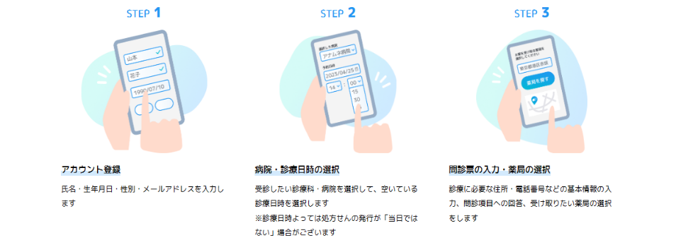 ・連携薬局:全国4600店以上の調剤薬局と連携しているので、最寄りの薬局でスムーズにお薬を受け取り可能。上記サイトの連携しているクリニック・薬局をご参照ください