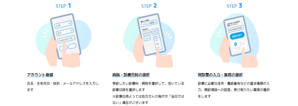 お薬の受け取りは、在庫の種類・量ともに安定している大手調剤薬局および調剤薬局併設ドラッグストア約6000施設と連携しており、自宅近くや職場近く宿泊したホテルの近くなど、その日の生活に合わせて自由に設定することができます。そのため、これまでも病院・クリニックを受診しにくかった小さな子供を抱えたママや女性固有の悩みを抱えていて婦人科を受診しにくかった女性などには、特に利用しやすいサービスとなっています。