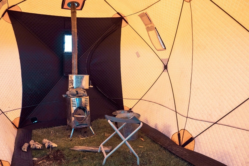 10人の参加者を5名ずつのグループに分け、片方のグループがサウナ小屋を建築している間に、もう片方のグループはテントサウナを体験していただけます。