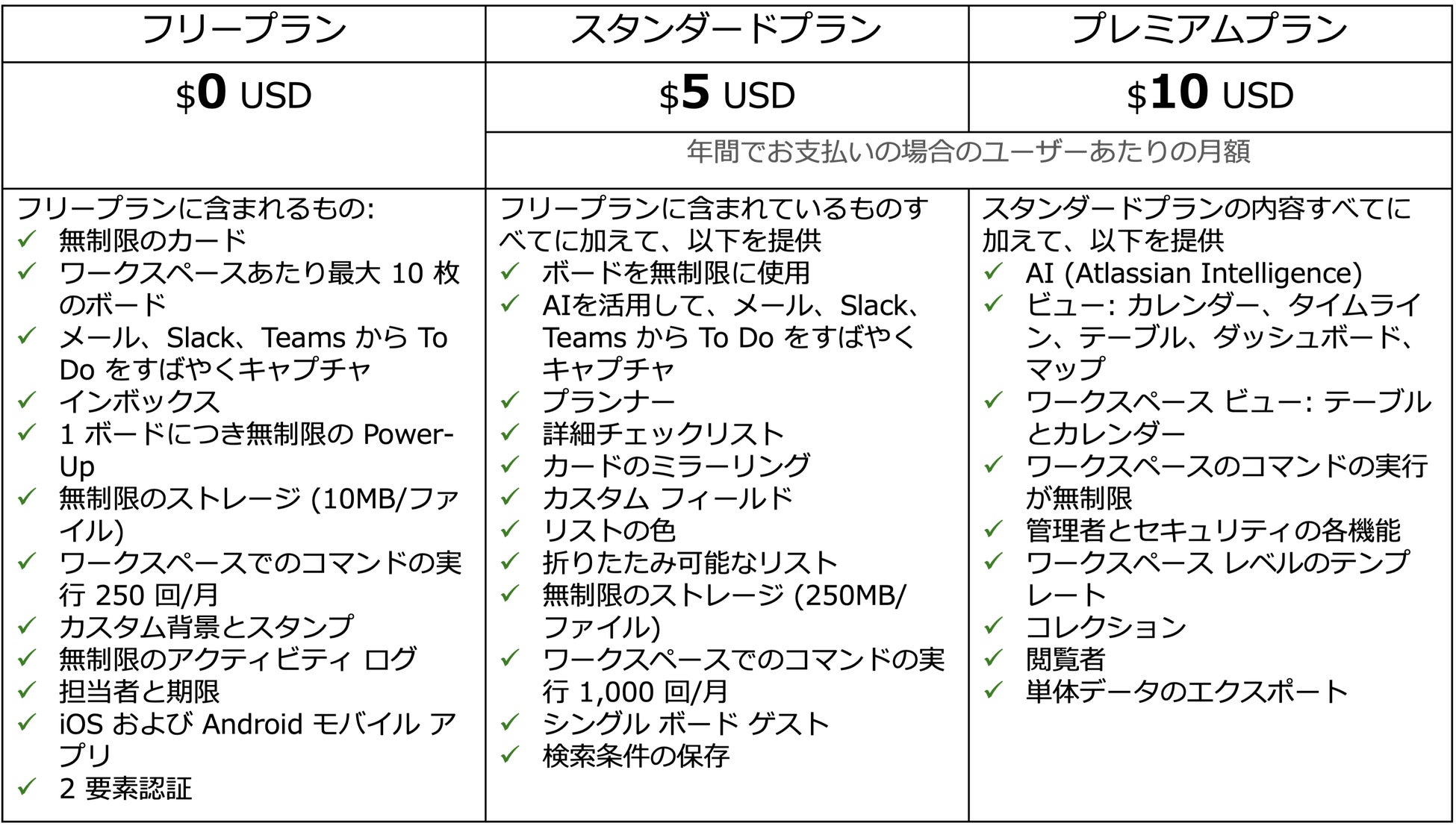 Trelloは、お客様のニーズに応じて、無料のフリープラン、有料のスタンダードプラン、プレミアムプラン、エンタープライズプランをご用意しています。