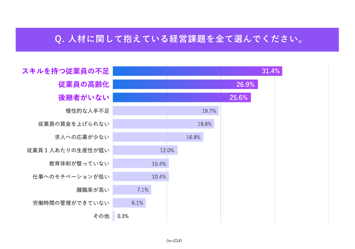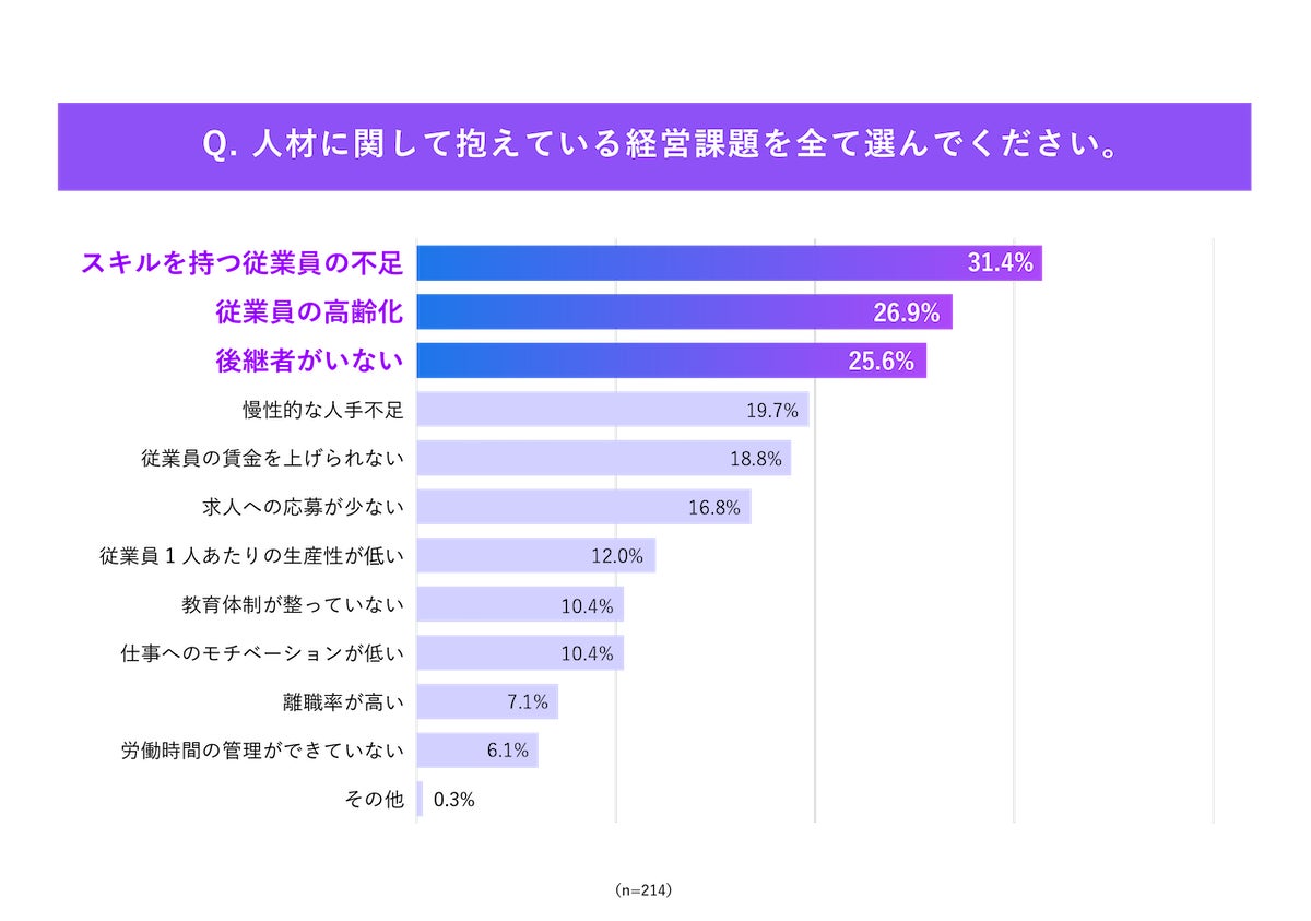 2) スキルを持つ従業員や次世代人材の確保が主な課題