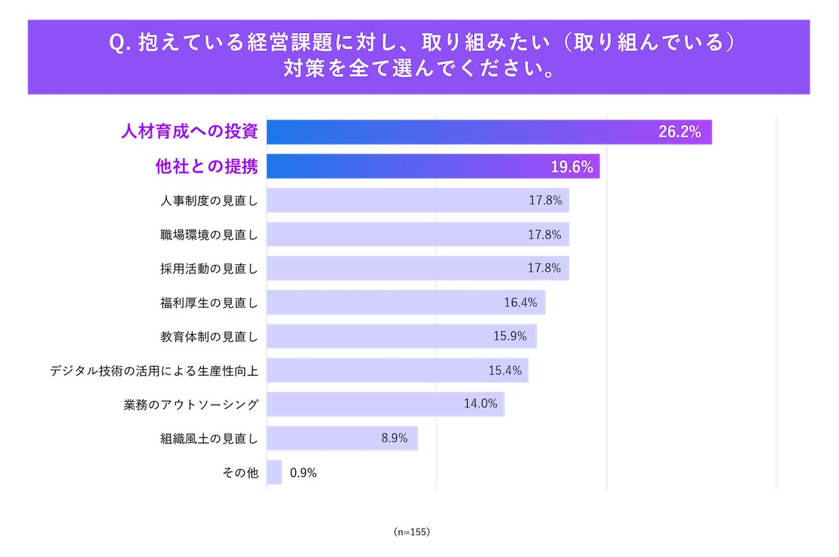 人材に関する課題に対して対策を検討・実施している企業においては、その対策として「人材育成への投資(26.2%)」と回答した割合が最も高く、人材への投資の重要性が浸透していることが伺えます。一方、自社単独で解決するのではなく「他社との連携(19.6%)」と回答した割合も高く、課題解決の選択肢として他社を活用するという方法が浸透しているということもうかがえます。