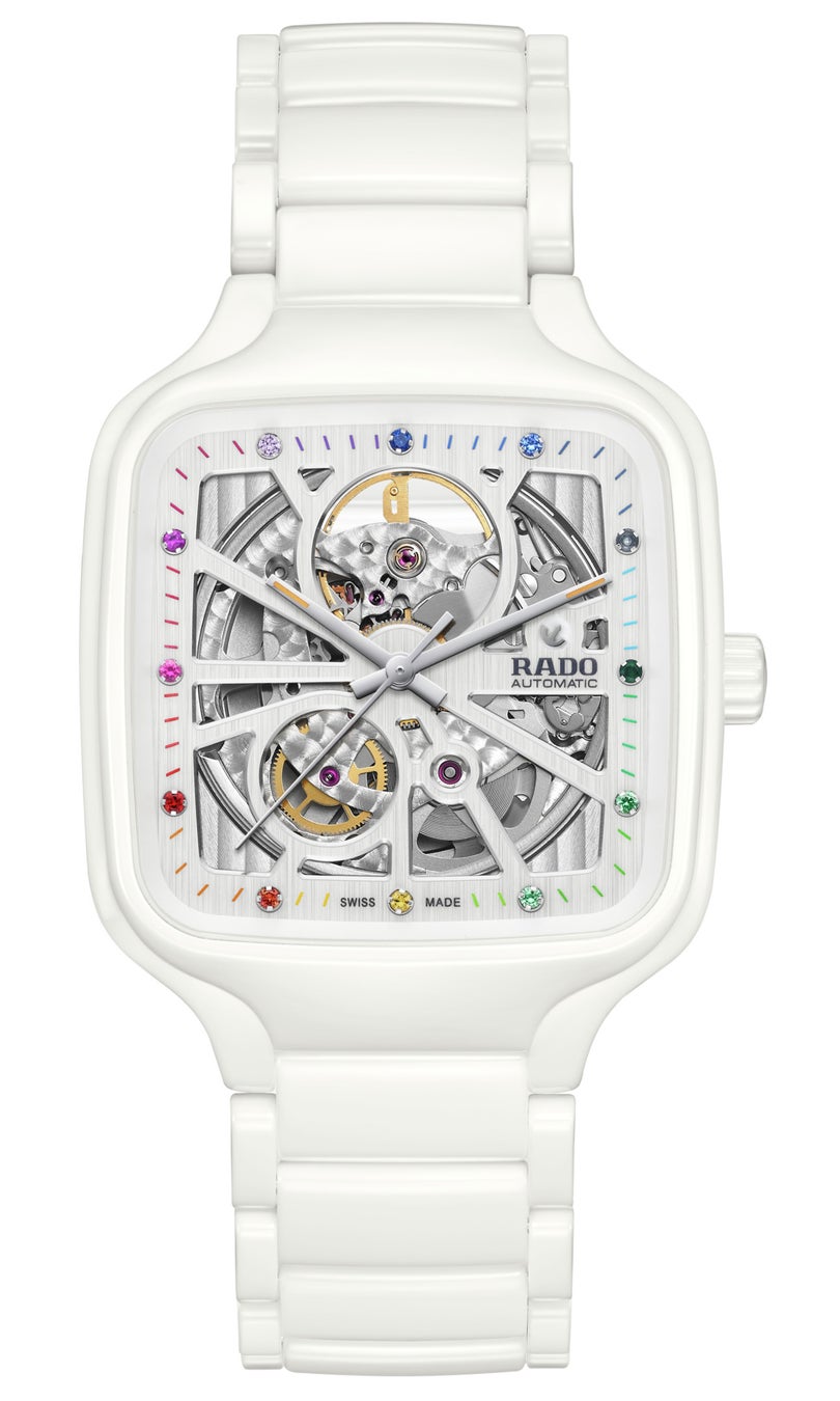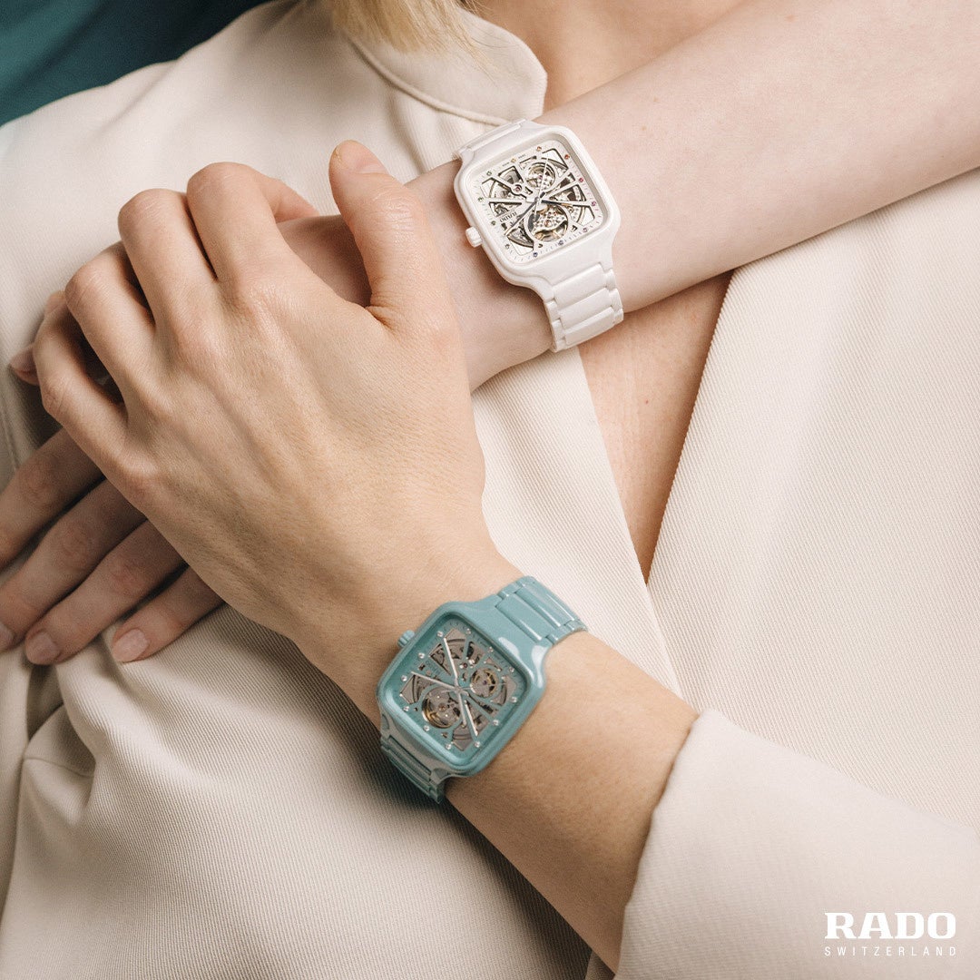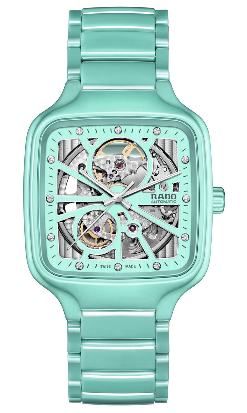 スケルトンダイヤルを特徴とし、そのシャープなラインとクリアな窓から自動巻きムーブメントR734の動きを見せてくれます。ラドーはこのコレクションに、ダイヤモンドのインデックスが目を引くターコイズと、白色のケースに万華鏡のようなカラフルな宝石をあしらった2つの新しいタイムピースを追加します。