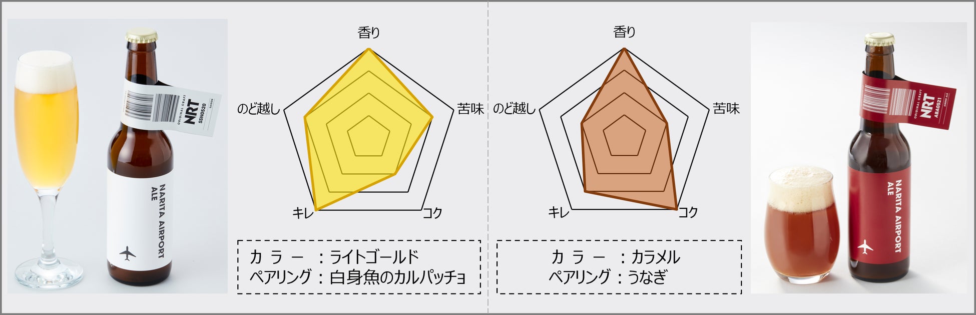 成田空港の華やかな出発階、これから始まる旅のわくわく感がコンセプトの「セゾン」と、旅の思い出を語りながらゆっくり味わう「アンバーエール」。