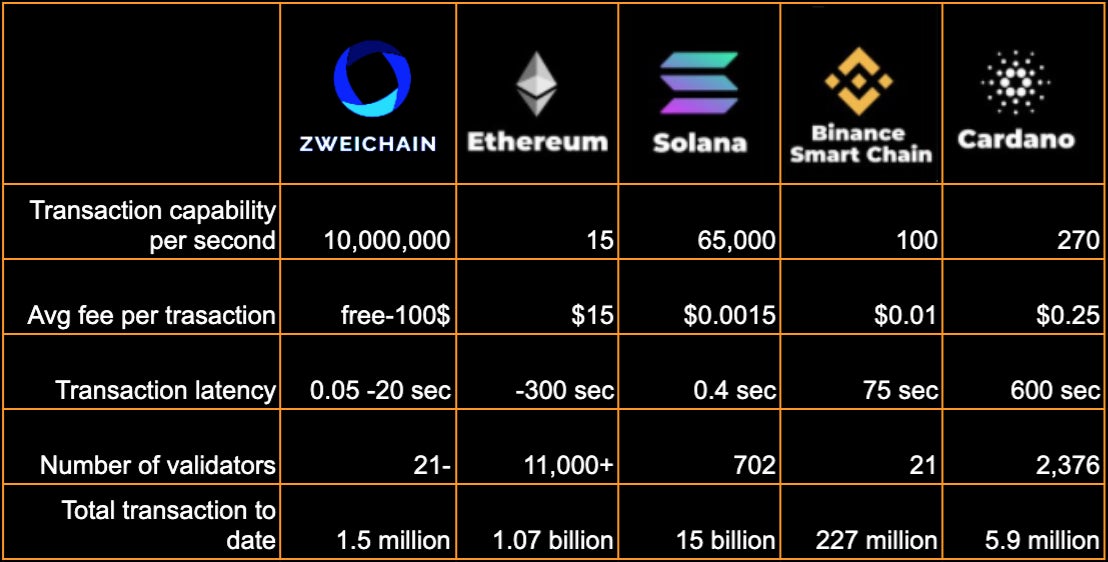ZWEICHAIN(ツバイチェーン)https://zweichain.zweicoin.com は、プライベートチェーンとパブリックチェーンからなり、パブリックチェーンにはその時々の一番効率のよいチェーンを採用しているが、今回は独自のパブリックチェーンの発表となる。同時に世界の主要なチェーンとの比較をしてみると、機能的にはほぼすべての点で優れている。